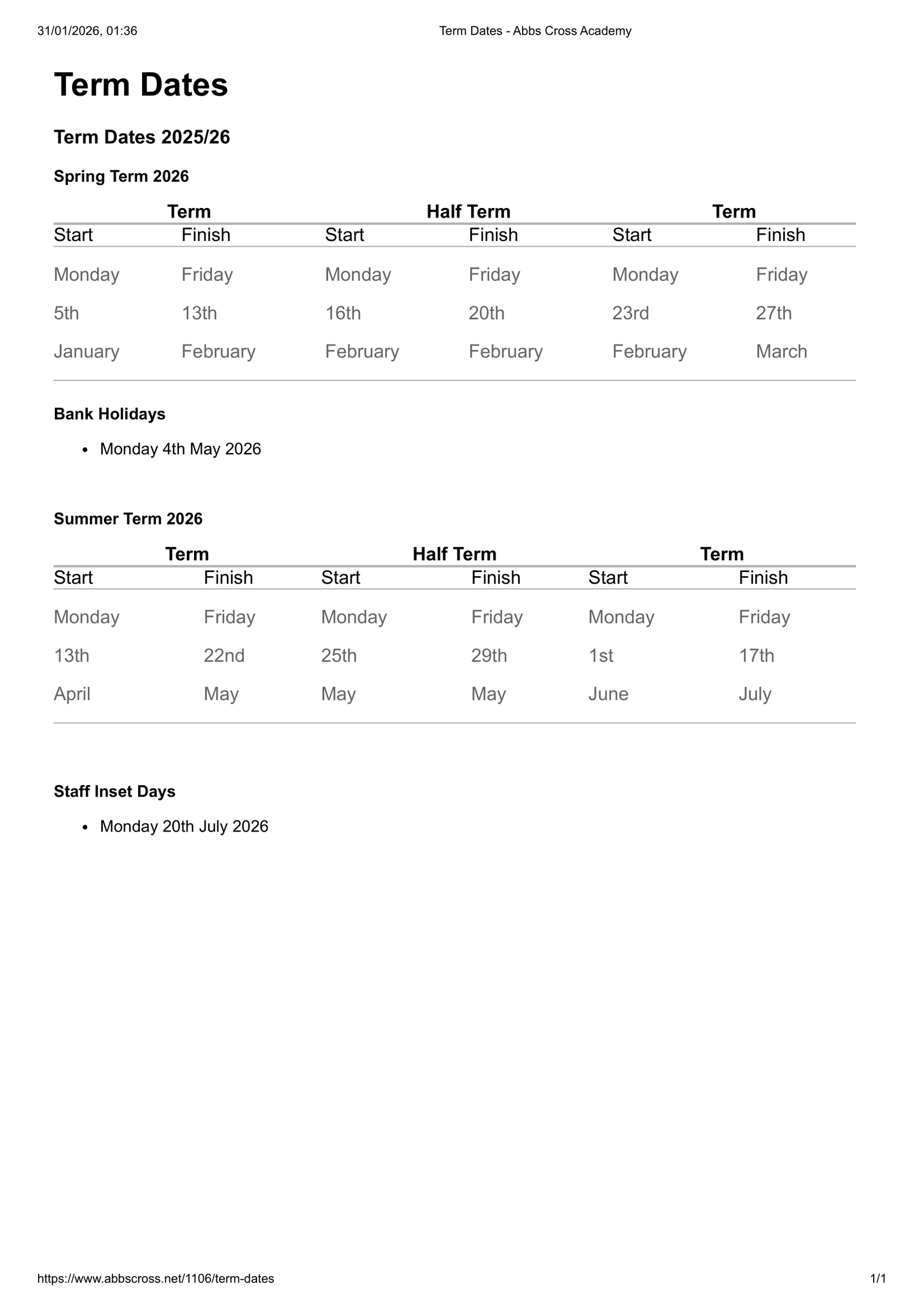 The school Term Dates shown on this page has been sourced directly from the official Abbs Cross Academy 25-26 Term Dates Revised website. Please be aware that all dates and events may be amended at the discretion of the school or local council. For the most up-to-date and accurate information, we recommend checking the official council website or contacting the school office.