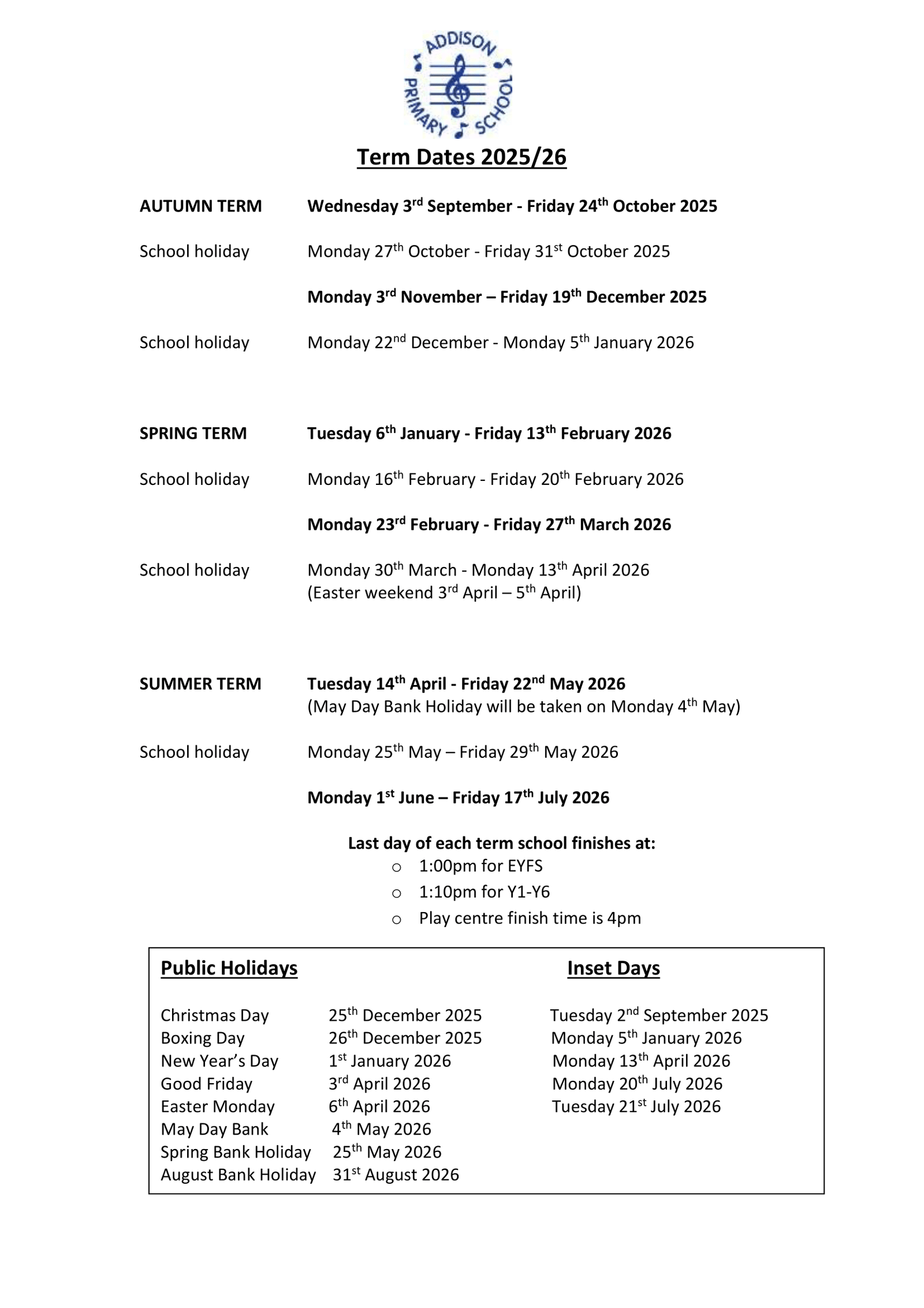 The school Term Dates shown on this page has been sourced directly from the official Addison Primary School Term Dates 25-26 Updated website. Please be aware that all dates and events may be amended at the discretion of the school or local council. For the most up-to-date and accurate information, we recommend checking the official council website or contacting the school office.