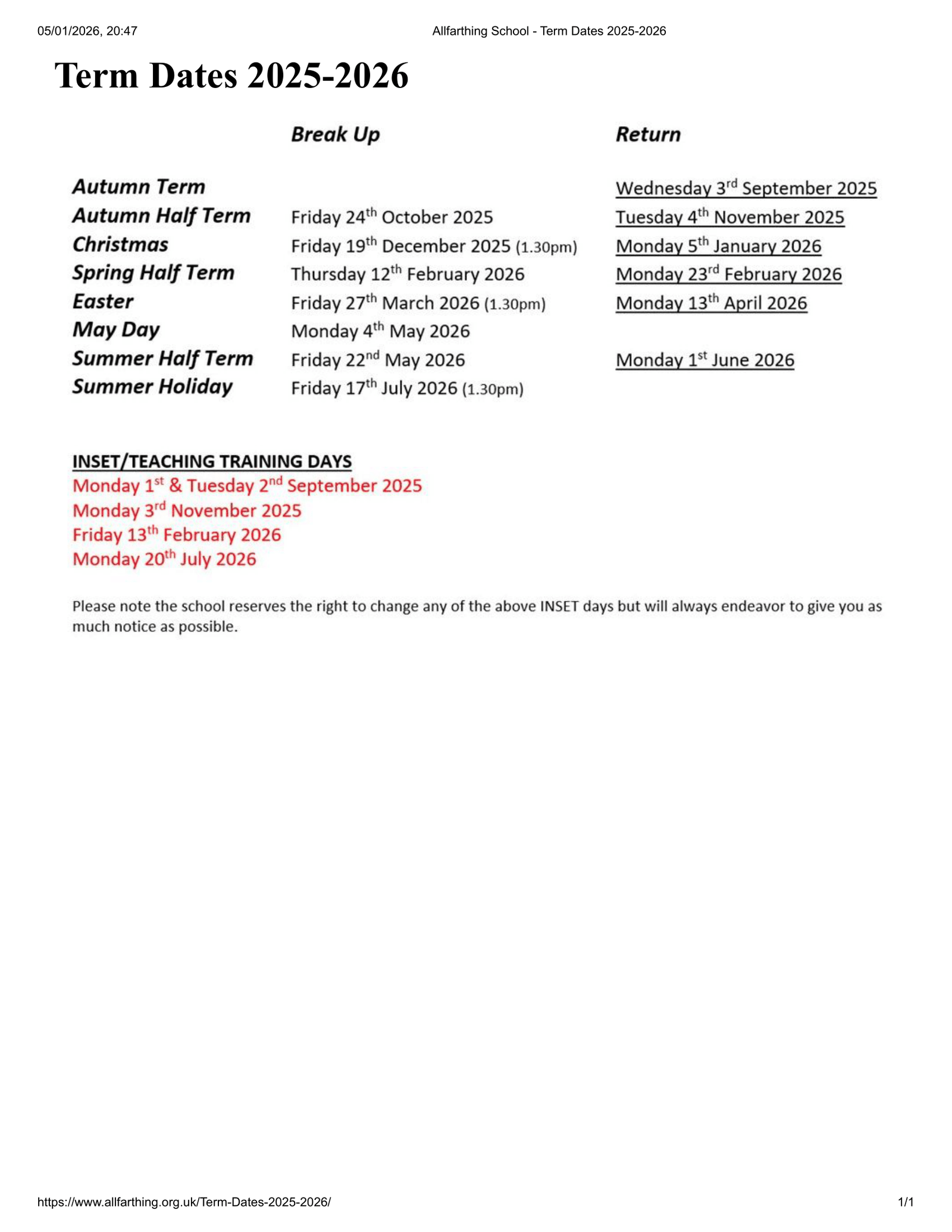 Please read: These dates are taken from the school’s published calendar for 2025–2026. Items reflect the legend categories (term dates, half terms, holidays, bank holidays, and inset days) exactly as shown on the calendar.