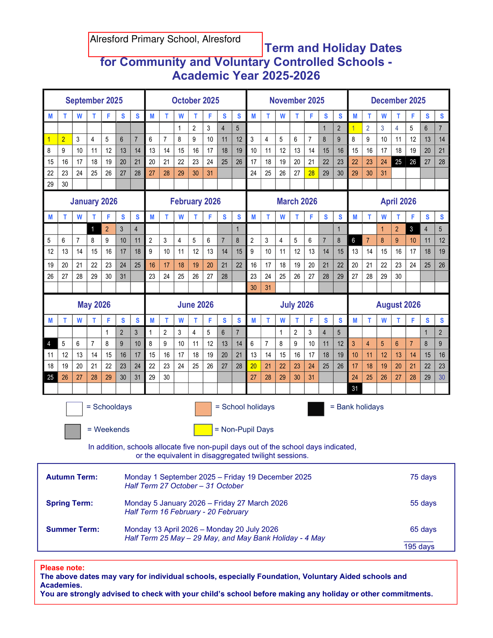• Total school days in 2025–2026: 195 days (Autumn 75, Spring 55, Summer 65).