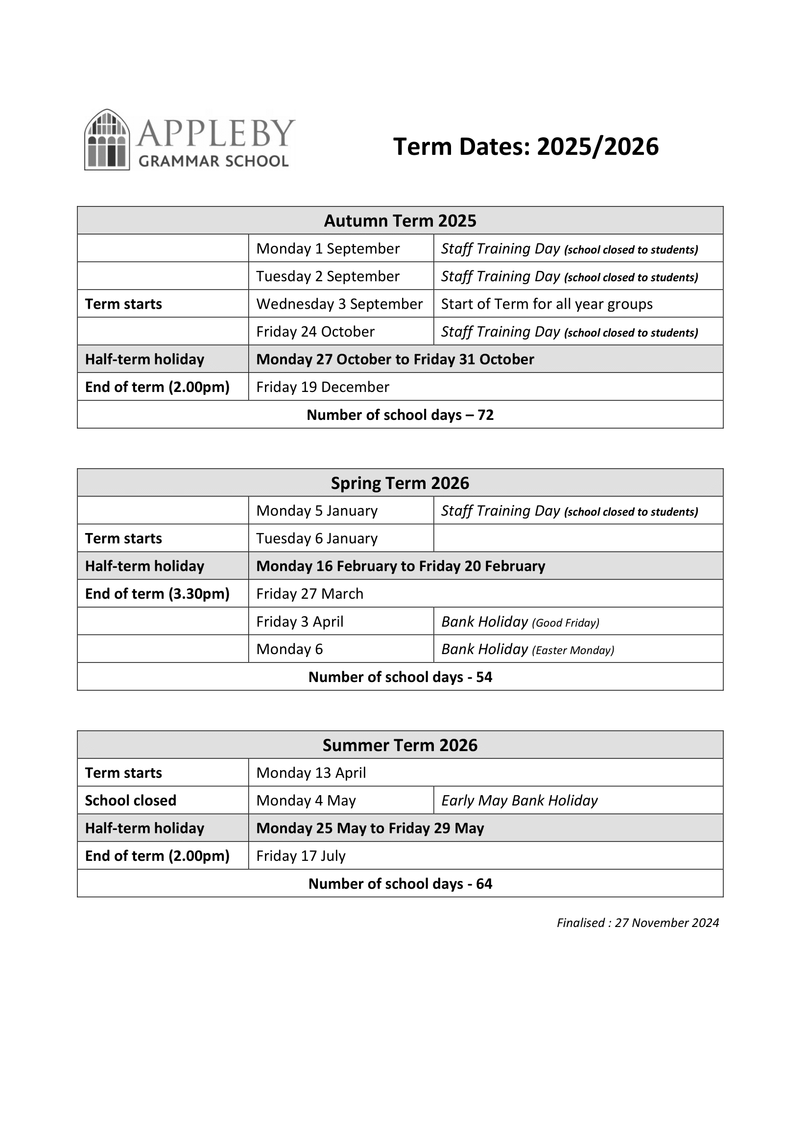 The Spring Term runs from Tuesday 6 January 2026 to Friday 27 March 2026.