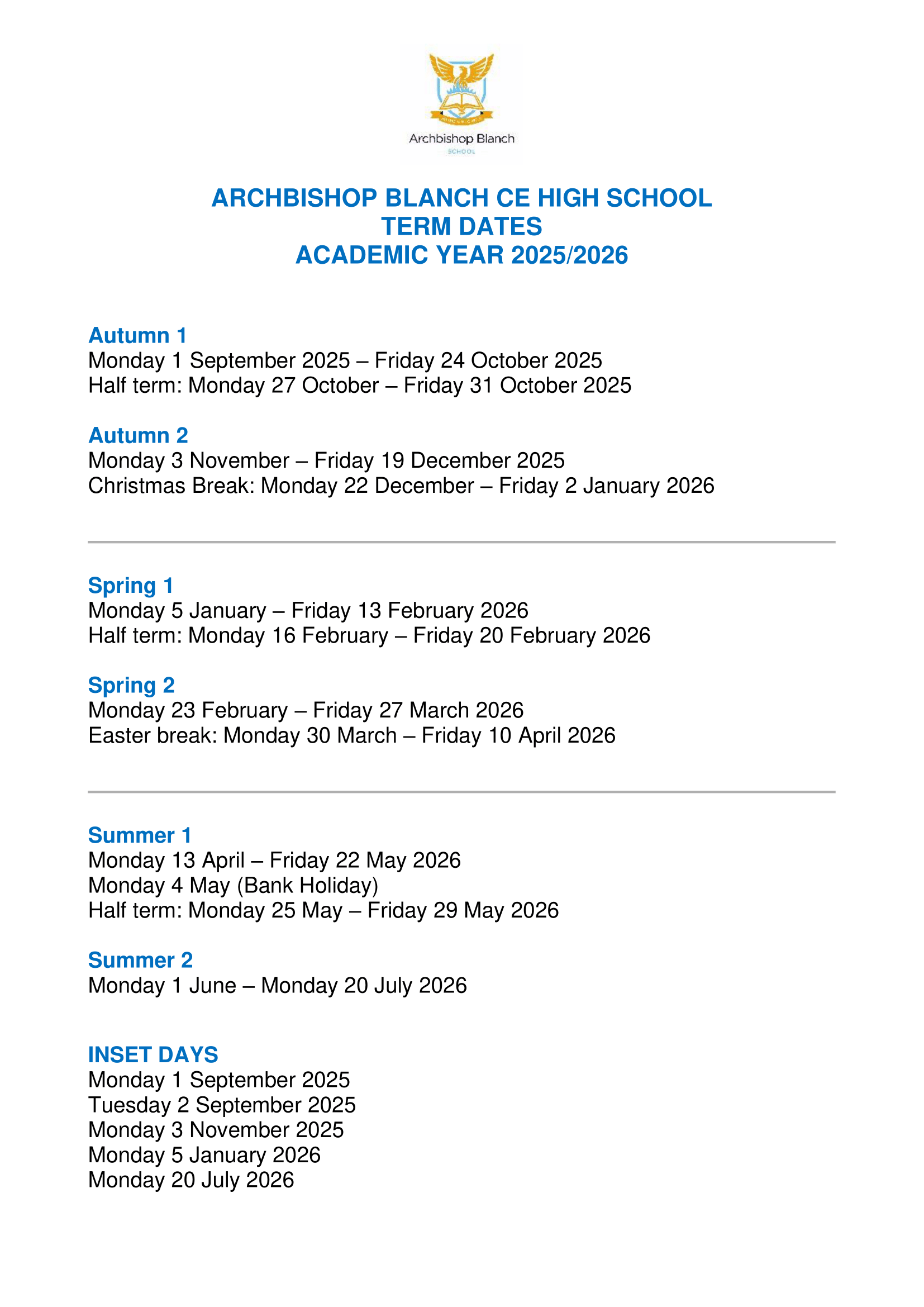 Archbishop Blanch CE High School Term dates (2025-2026)