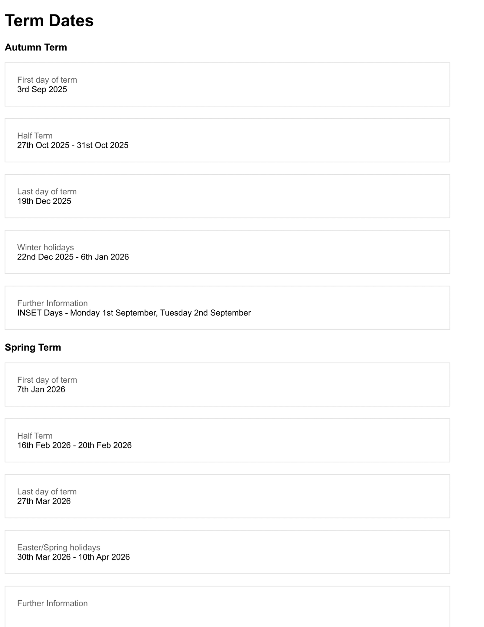 The Spring Term begins on Wednesday 7 January 2026 and finishes on Friday 27 March 2026.