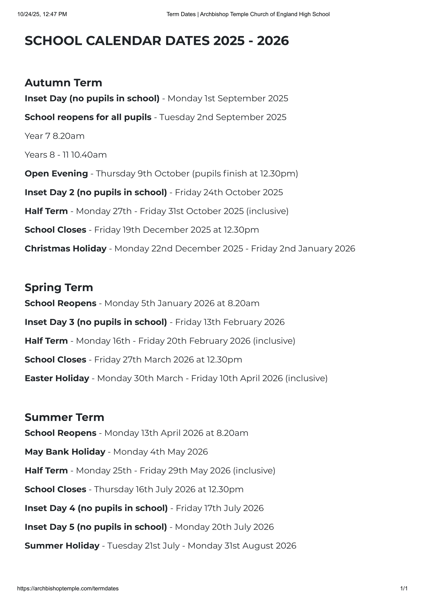 Archbishop Temple Church of England High School Term dates (2025-2026)