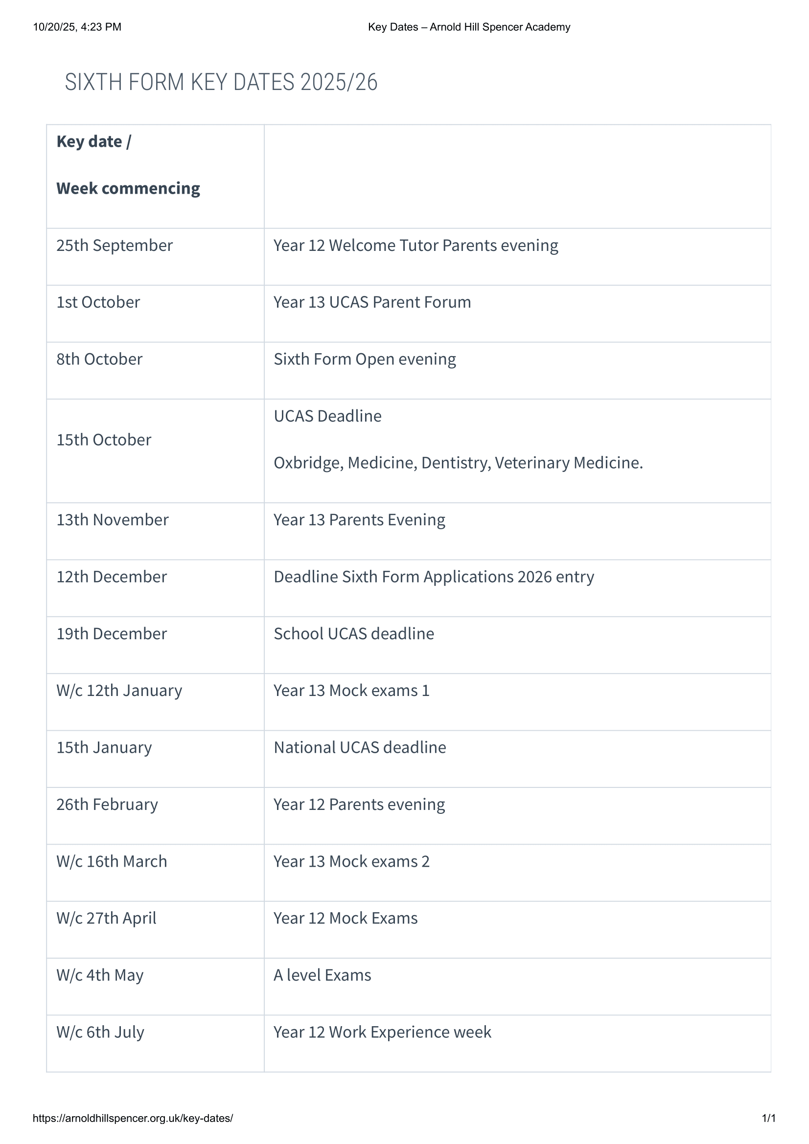 Arnold Hill Spencer Academy – Sixth Form Key Dates 2025/26