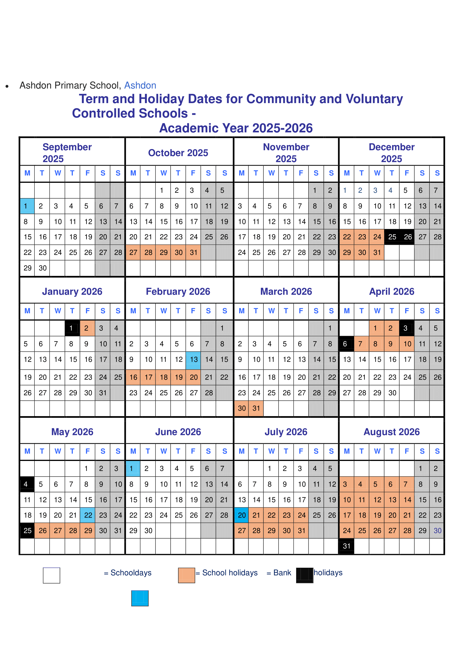 The school Term Dates shown on this page has been sourced directly from the official Ashdon Primary School term dates website. Please be aware that all dates and events may be amended at the discretion of the school or local council. For the most up-to-date and accurate information, we recommend checking the official council website or contacting the school office.
