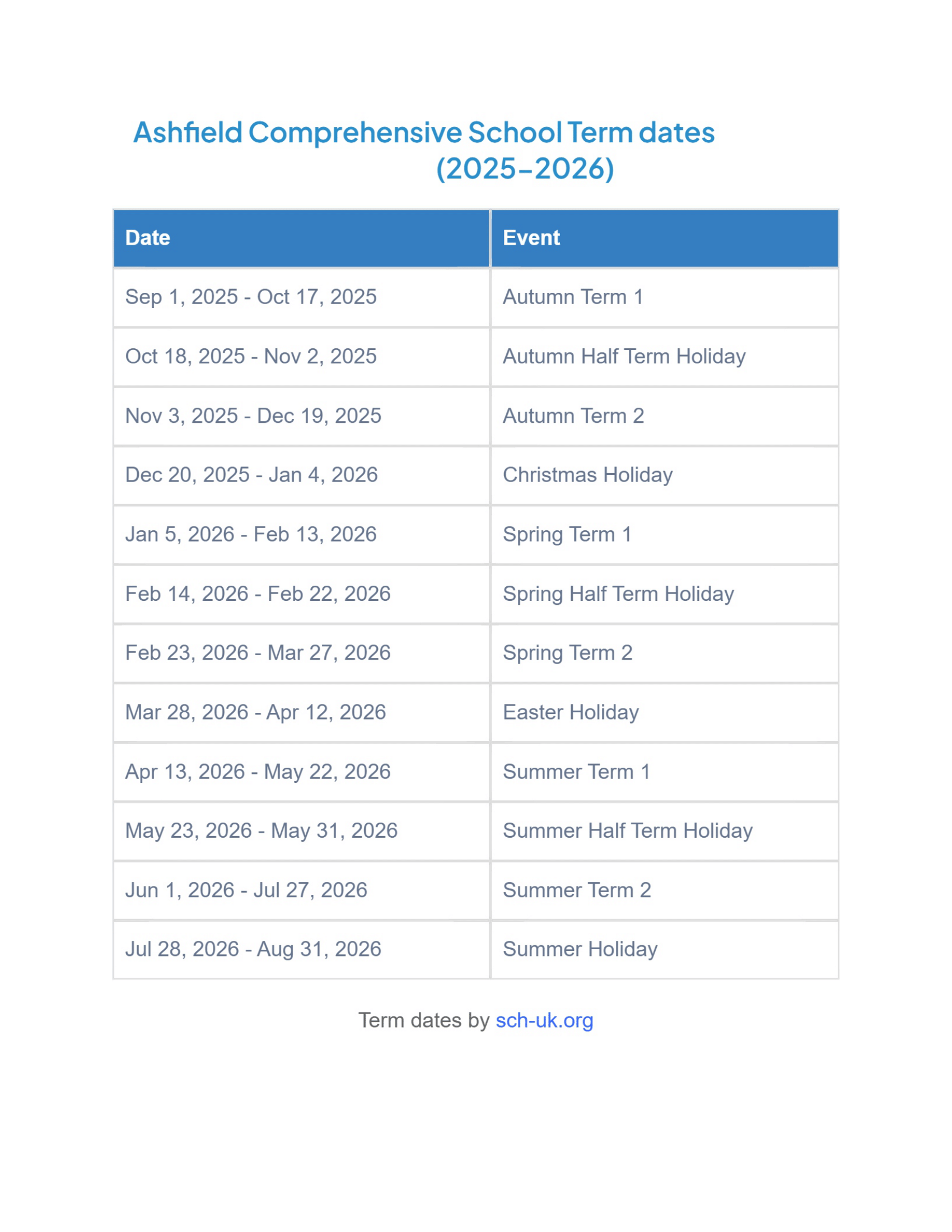 Ashfield Comprehensive School Term Dates (2025–2026) – FAQ