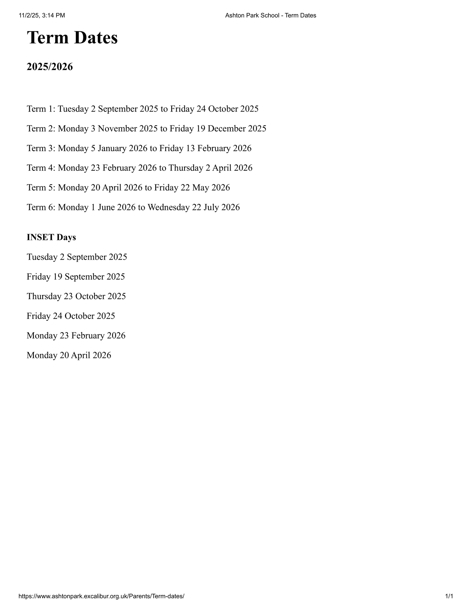 Ashton Park School Term dates (2025-2026)