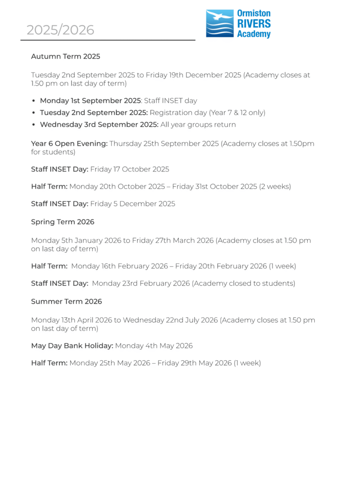View Original Calendar Essex County Council Calendar PDF Ormiston Rivers Academy Term dates (2024-2025) Ormiston Rivers Academy Term dates (2024-2025)