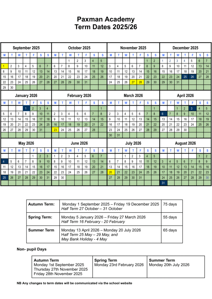 View Original Calendar Essex County Council Calendar PDF Paxman Academy Term dates (2025-2026) Paxman Academy Term dates (2025-2026) Term dates