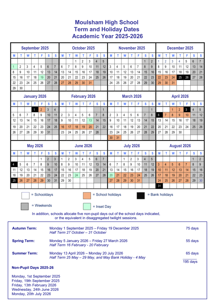 View Original Calendar Essex County Council Calendar PDF Moulsham High School Term dates (2025-2026) Moulsham High School Term dates (2025-2026)