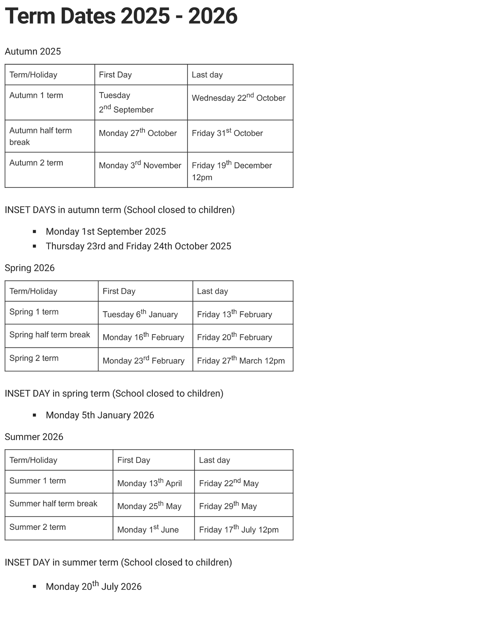 The INSET days are Monday 1 September 2025, Thursday 23 October 2025, Friday 24 October 2025, Monday 5 January 2026, and Monday 20 July 2026. The school is closed to children on these days.