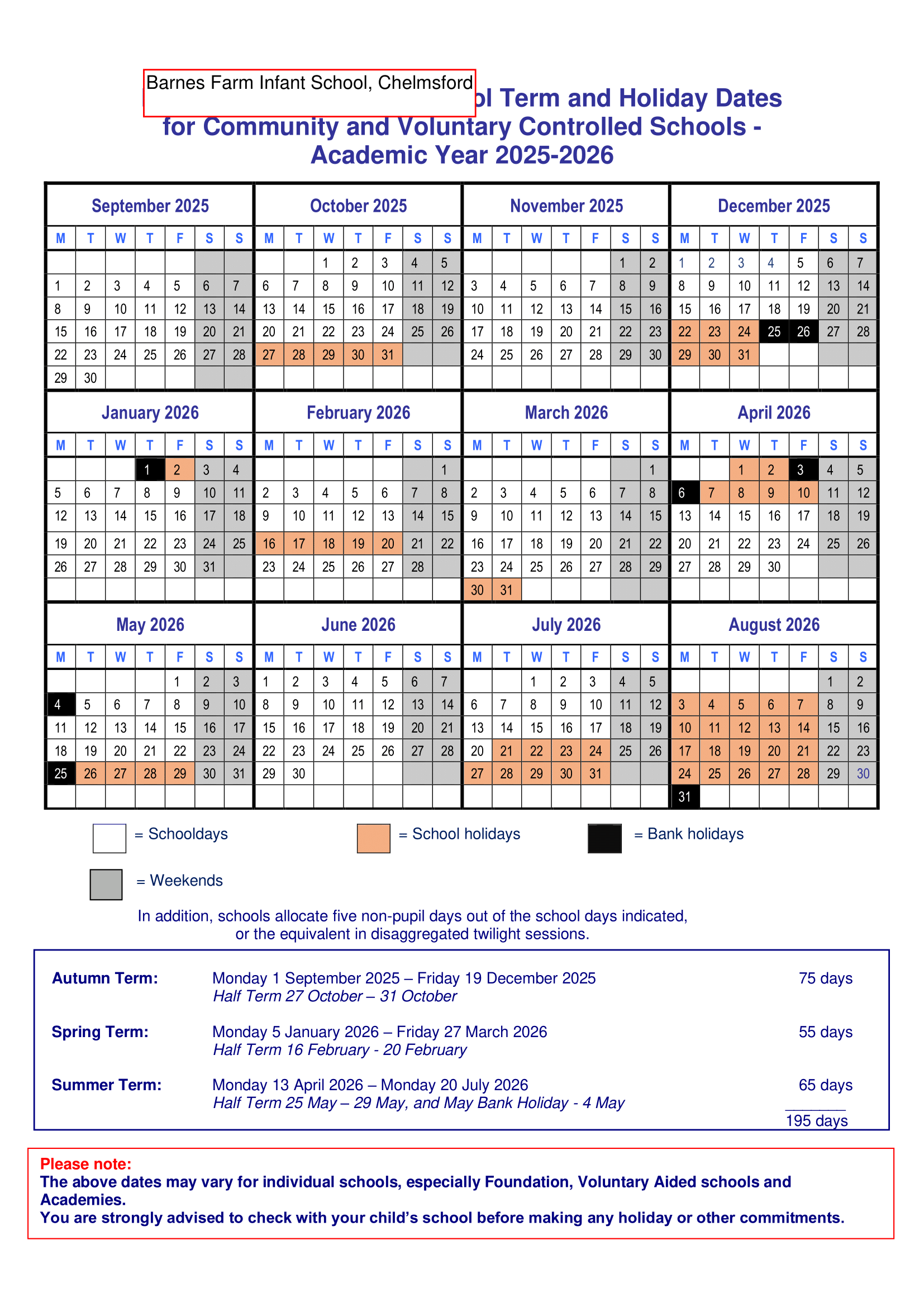 Barnes Farm Infant School, Chelmsford Term dates (2025-2026)