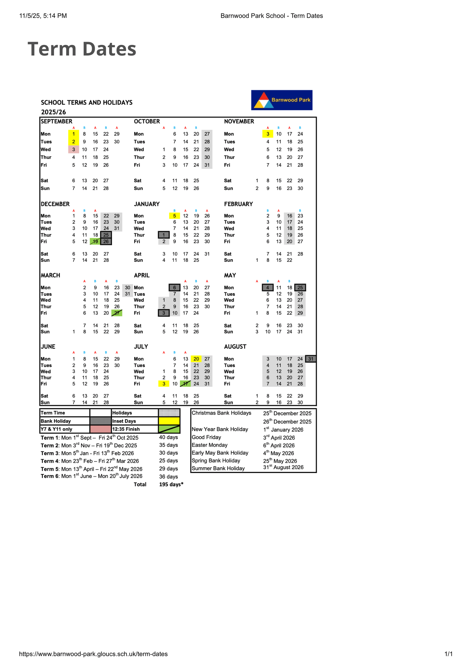 Please read: These dates are taken from the school’s published calendar for 2025–2026. Items reflect the legend categories (term dates, half terms, holidays, bank holidays, and inset days) exactly as shown on the calendar.