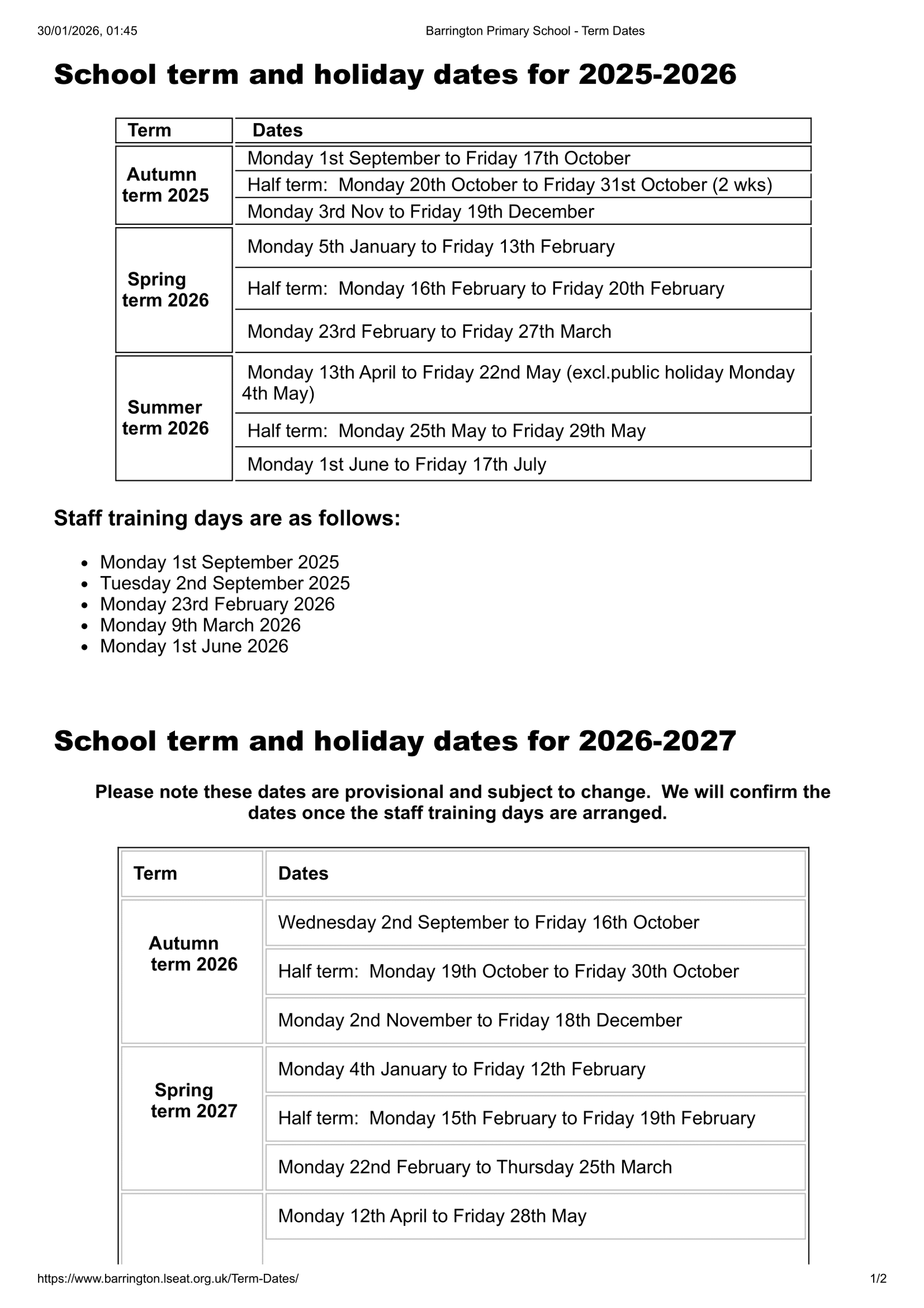 The school Term Dates shown on this page has been sourced directly from the official Barrington Primary School 25-26 Term Dates Revised PDF website. Please be aware that all dates and events may be amended at the discretion of the school or local council. For the most up-to-date and accurate information, we recommend checking the official council website or contacting the school office.