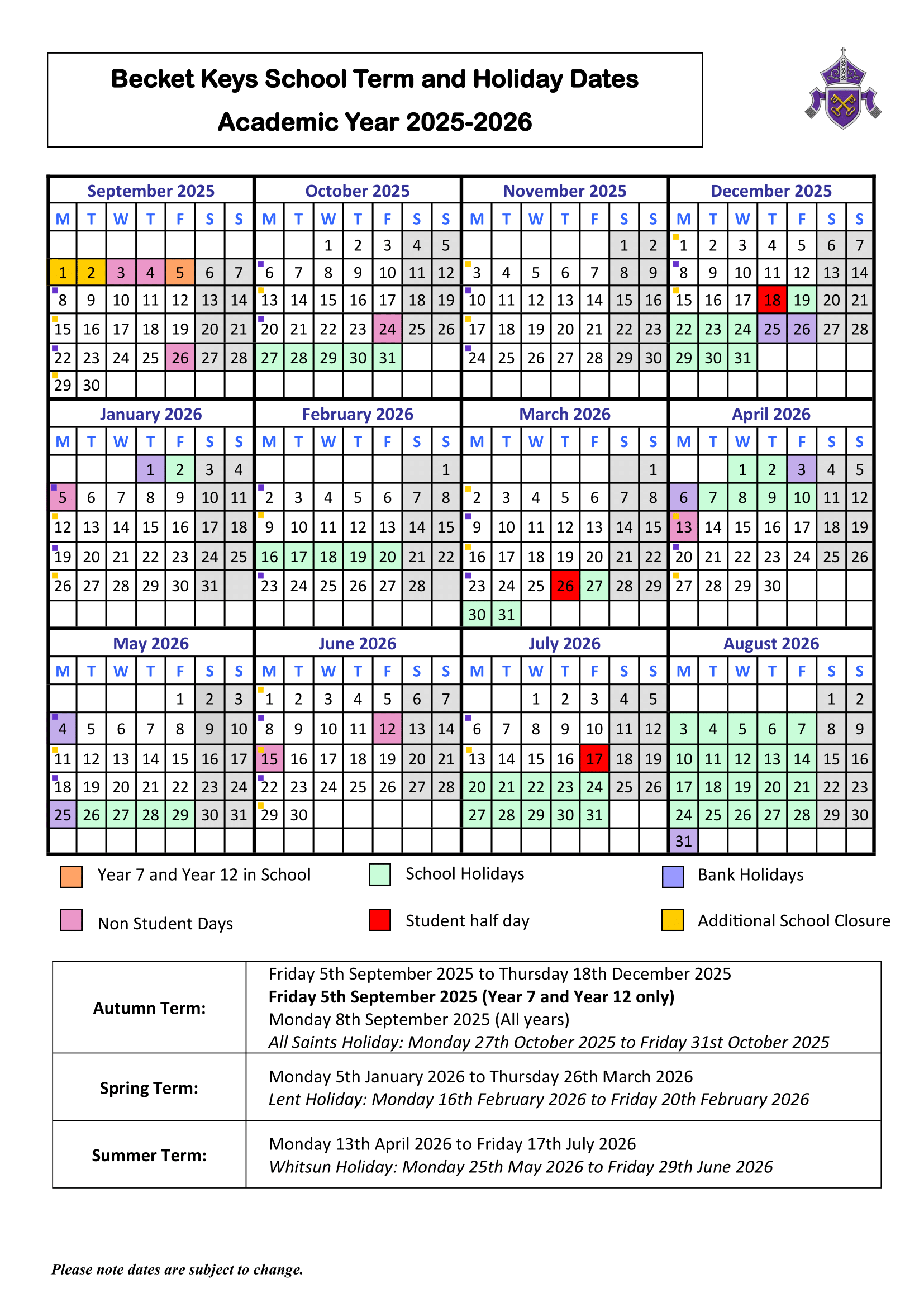 The printable school calendar provided on this page is taken from the official Becket Keys School Brentwood Term Dates Calendar website. Please note that all dates and events are subject to change at the discretion of the school Council. For the most accurate and updated information, please refer to the official council website or contact the school helpline.