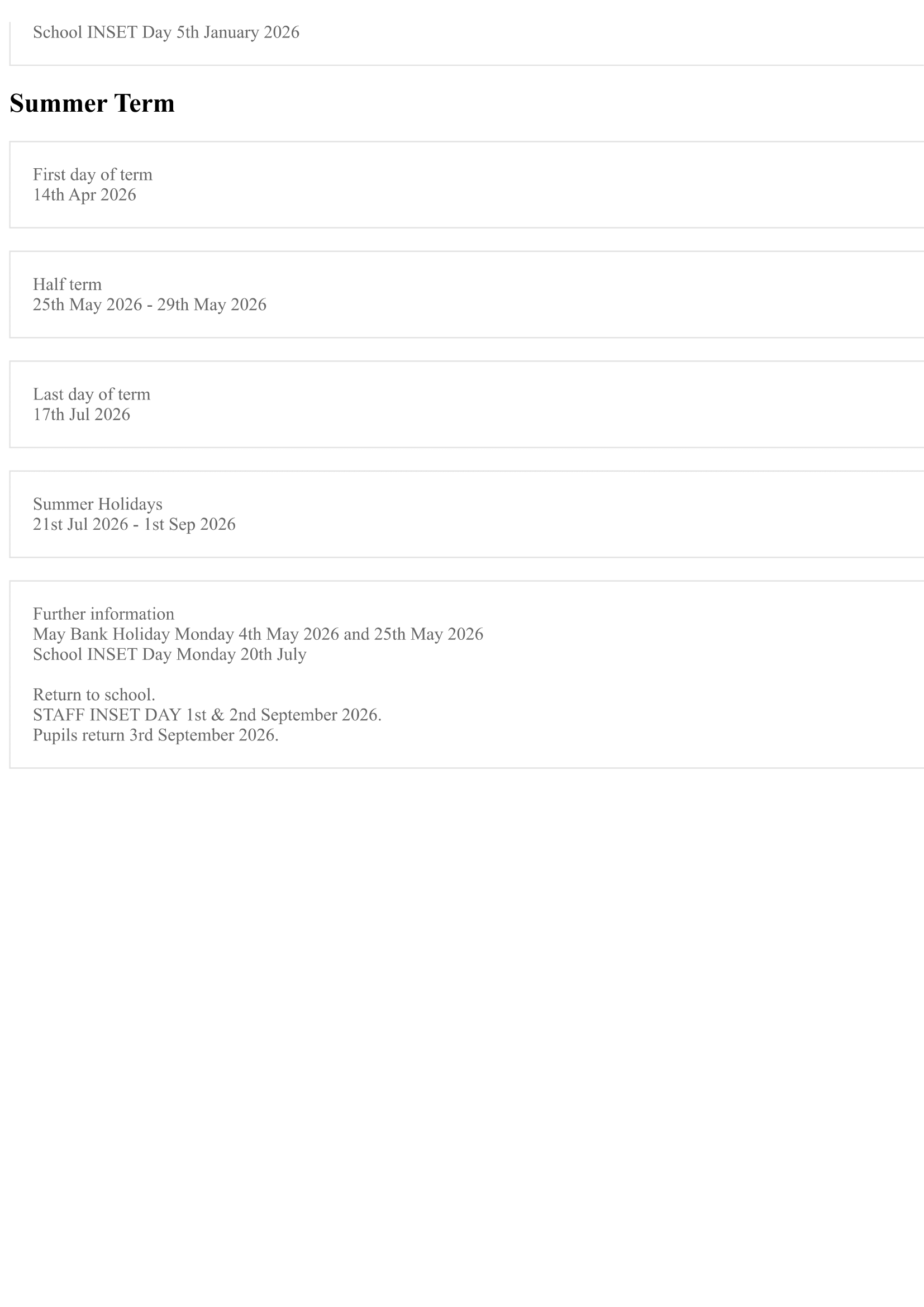 | Feb 16 - Feb 20, 2026 | Spring Half Term |