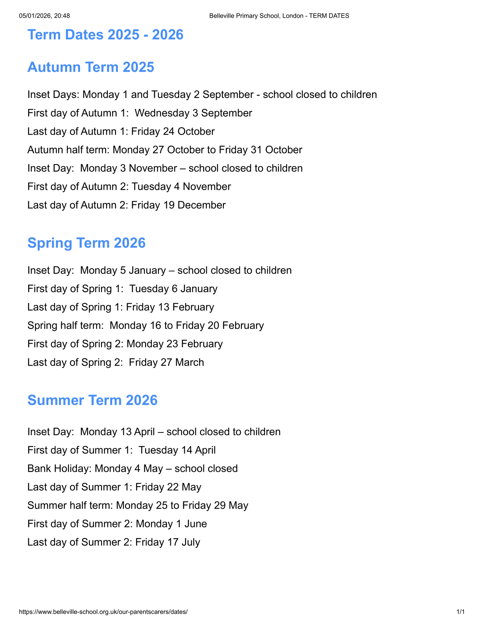 Belleville Primary School, London Term Dates 2025–2026