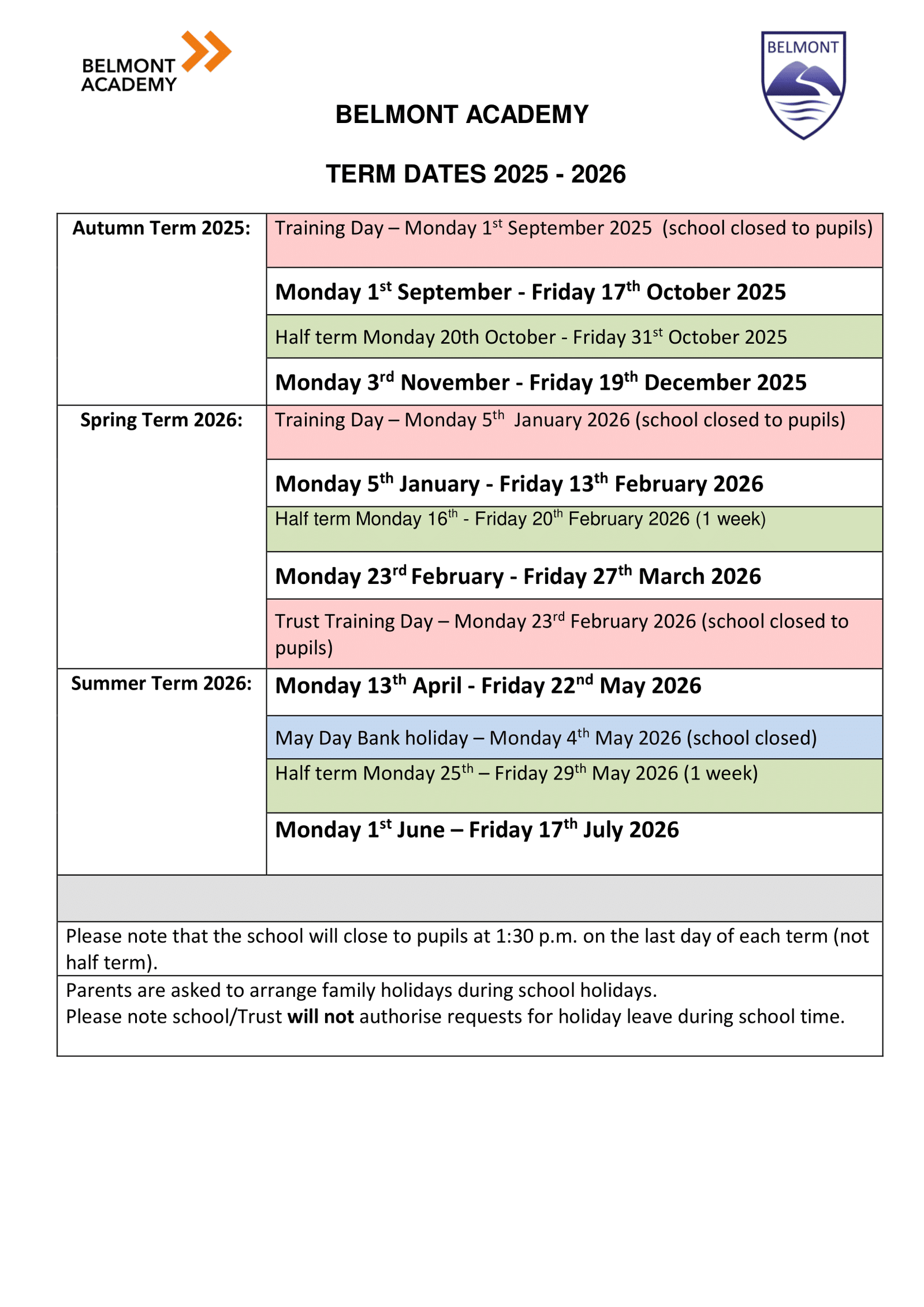 The school Term Dates shown on this page has been sourced directly from the official Belmont Academy 25-26 Term Dates Revised PDF website. Please be aware that all dates and events may be amended at the discretion of the school or local council. For the most up-to-date and accurate information, we recommend checking the official council website or contacting the school office.