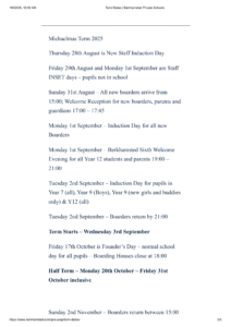 - Induction/Welcome events: Sunday 31 August – Tuesday 2 September 2025 (new boarders; Sixth Welcome; year-group inductions)