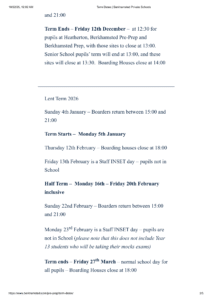 - Boarders return windows: Sunday 2 November 2025; Sunday 22 February 2026; Sunday 31 May 2026 (15:00–21:00 each)
