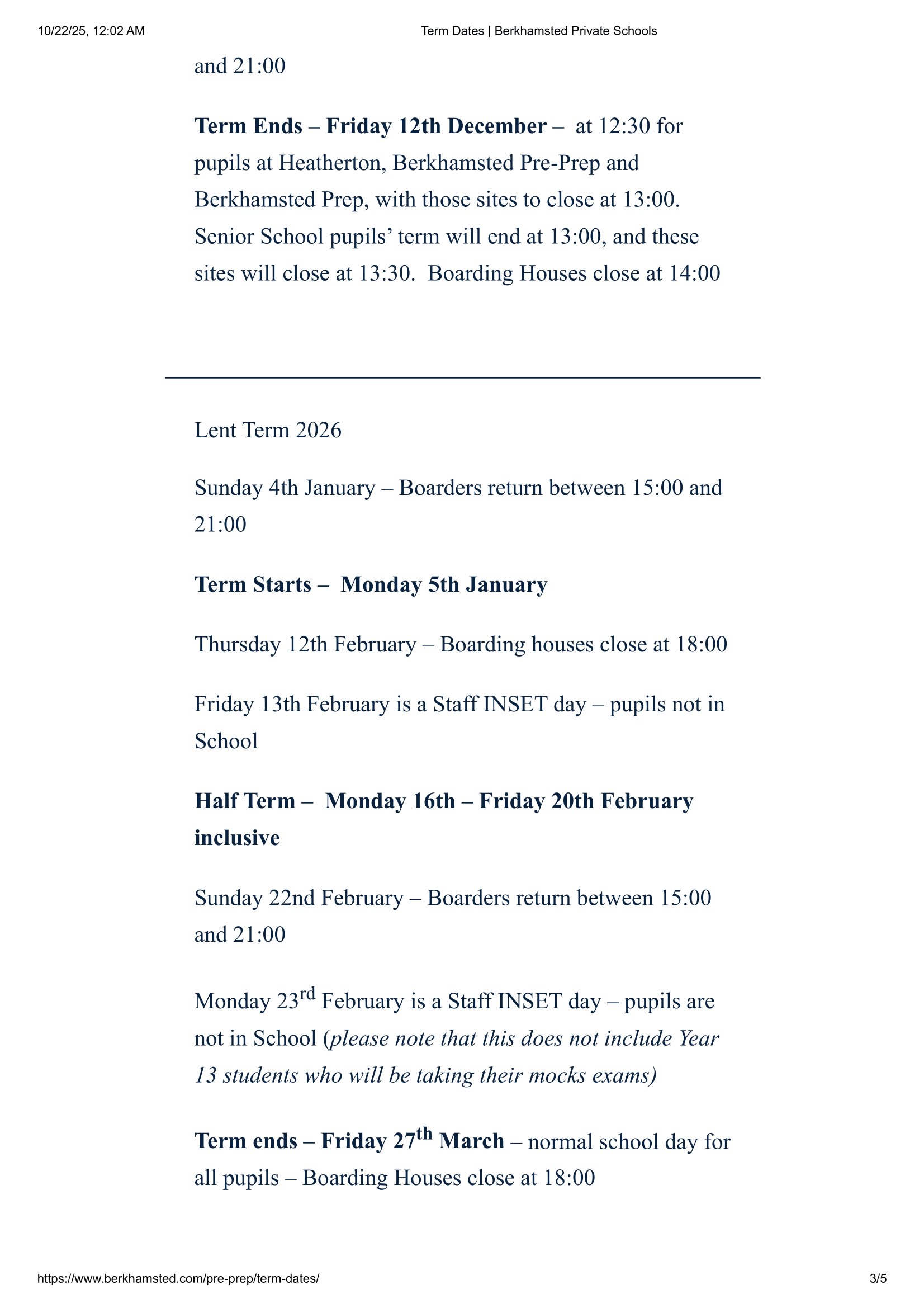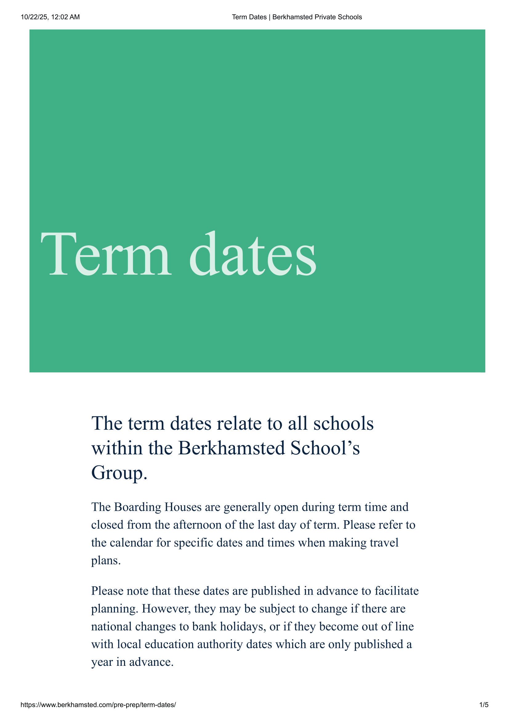 The school Term Dates shown on this page has been sourced directly from the official Berkhamsted School Hertfordshire Term Dates term dates website. Please be aware that all dates and events may be amended at the discretion of the school or local council. For the most up-to-date and accurate information, we recommend checking the official council website or contacting the school office.