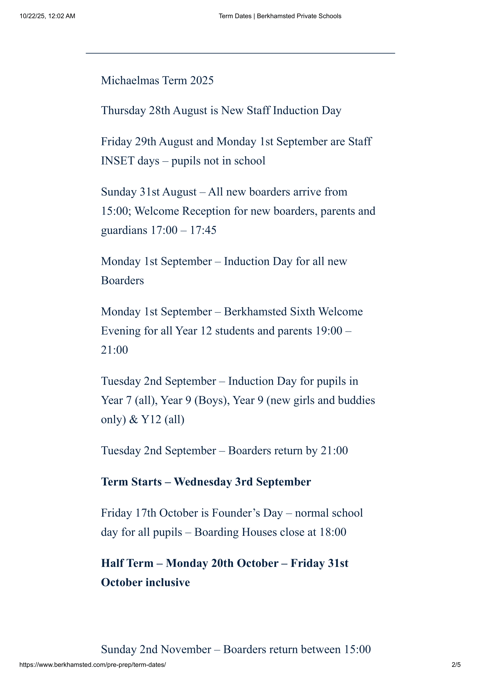 - Founder’s Day: Friday 17 October 2025 (normal school day; boarding houses close 18:00)