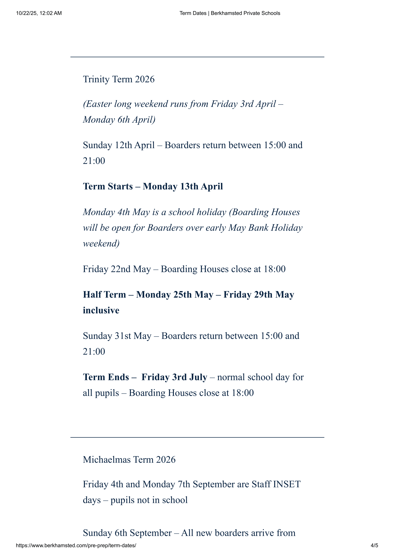 - Boarders return windows: Sunday 2 November 2025; Sunday 22 February 2026; Sunday 31 May 2026 (15:00–21:00 each)