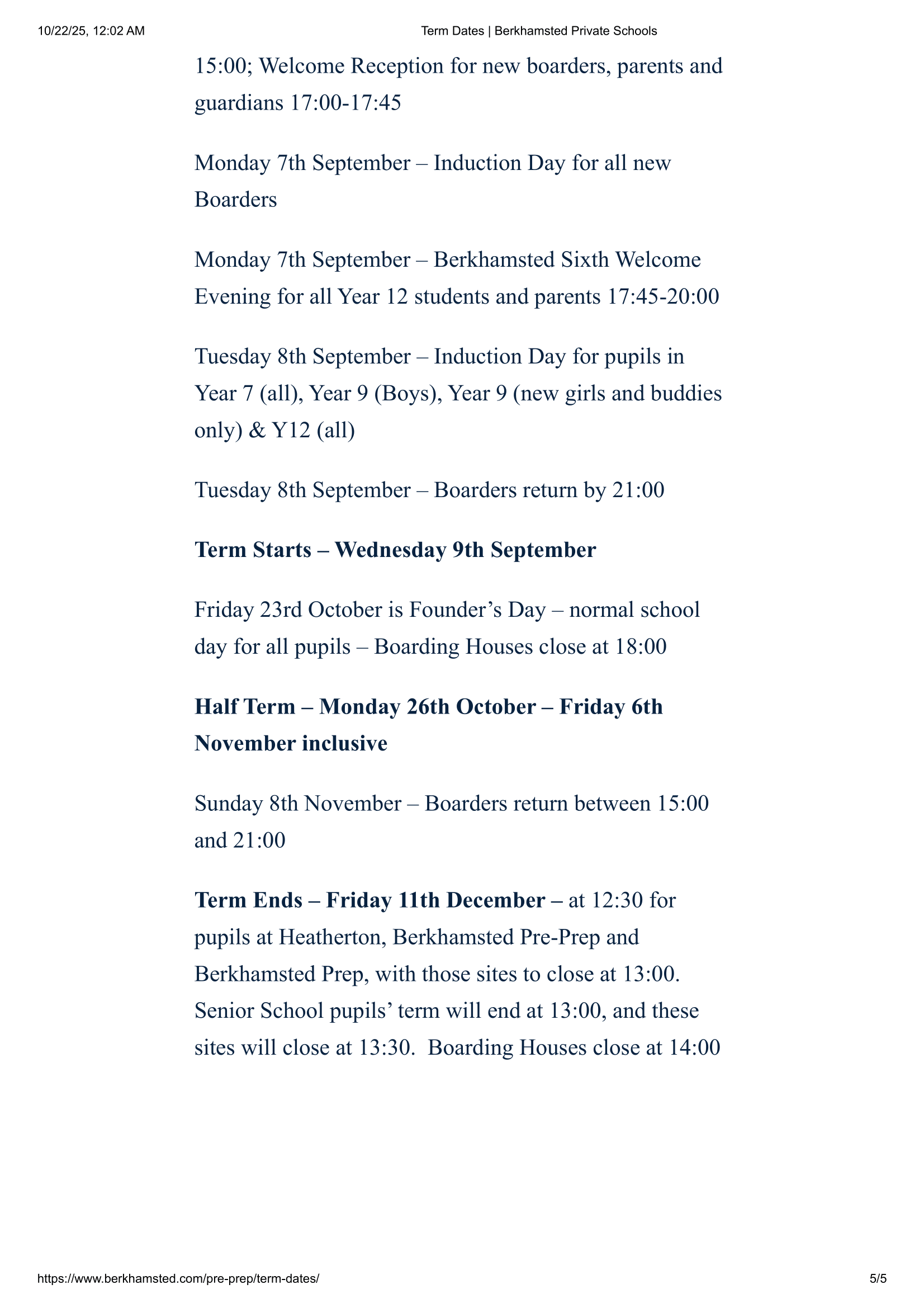 - Induction/Welcome events: Sunday 31 August – Tuesday 2 September 2025 (new boarders; Sixth Welcome; year-group inductions)