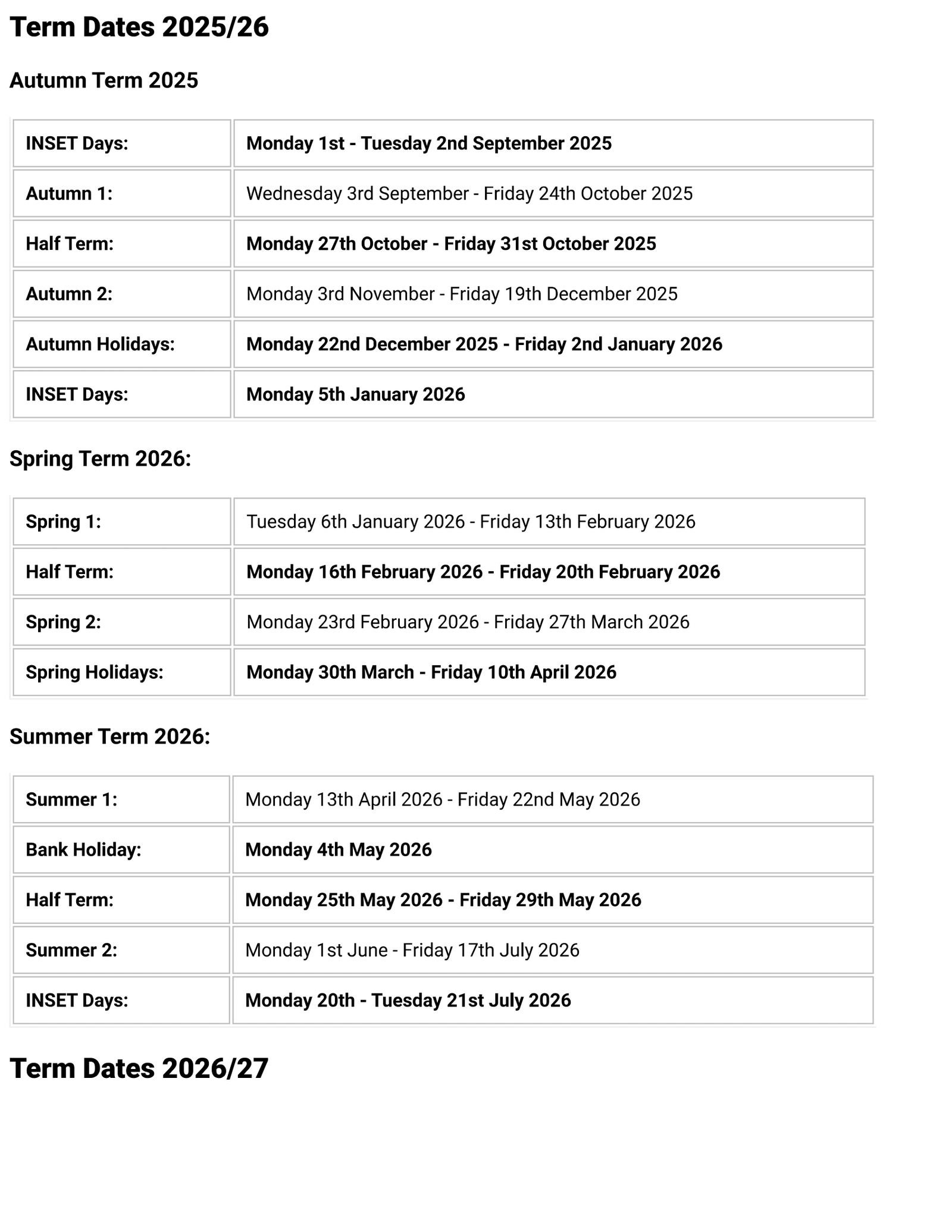 | Oct 27 – Oct 31, 2025 | Autumn Half Term |
