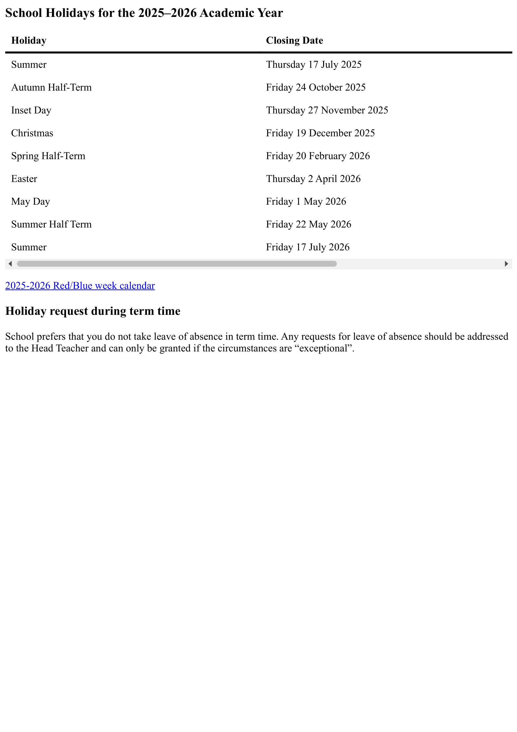 - Summer Half-Term closure: Friday 22 May 2026