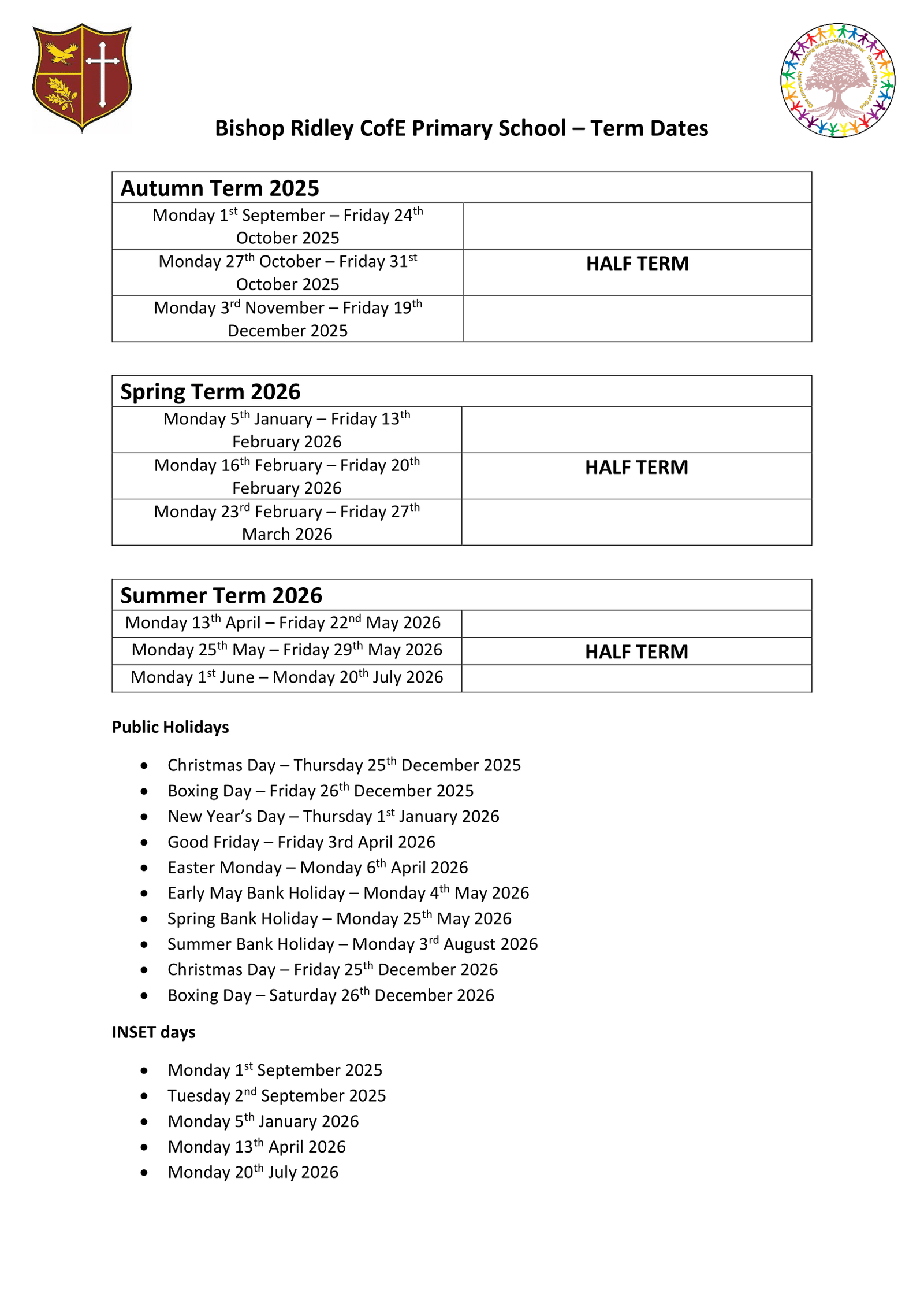 Bishop Ridley CofE Primary School Term Dates 2025–2026