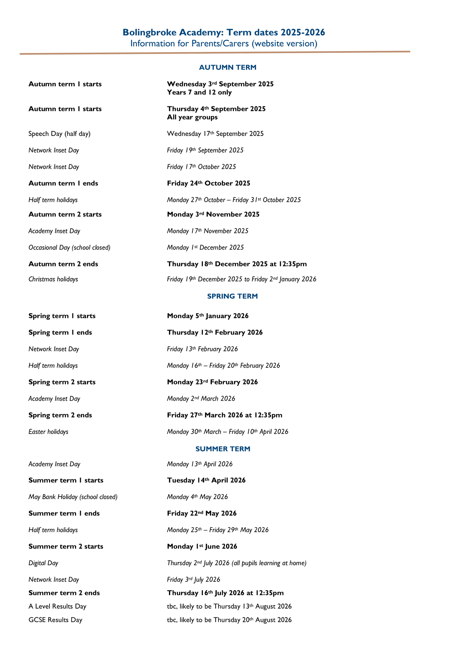 The school Term Dates shown on this page has been sourced directly from the official Bolingbroke Academy School term dates 25-26 Official Updates website. Please be aware that all dates and events may be amended at the discretion of the school or local council. For the most up-to-date and accurate information, we recommend checking the official council website or contacting the school office.