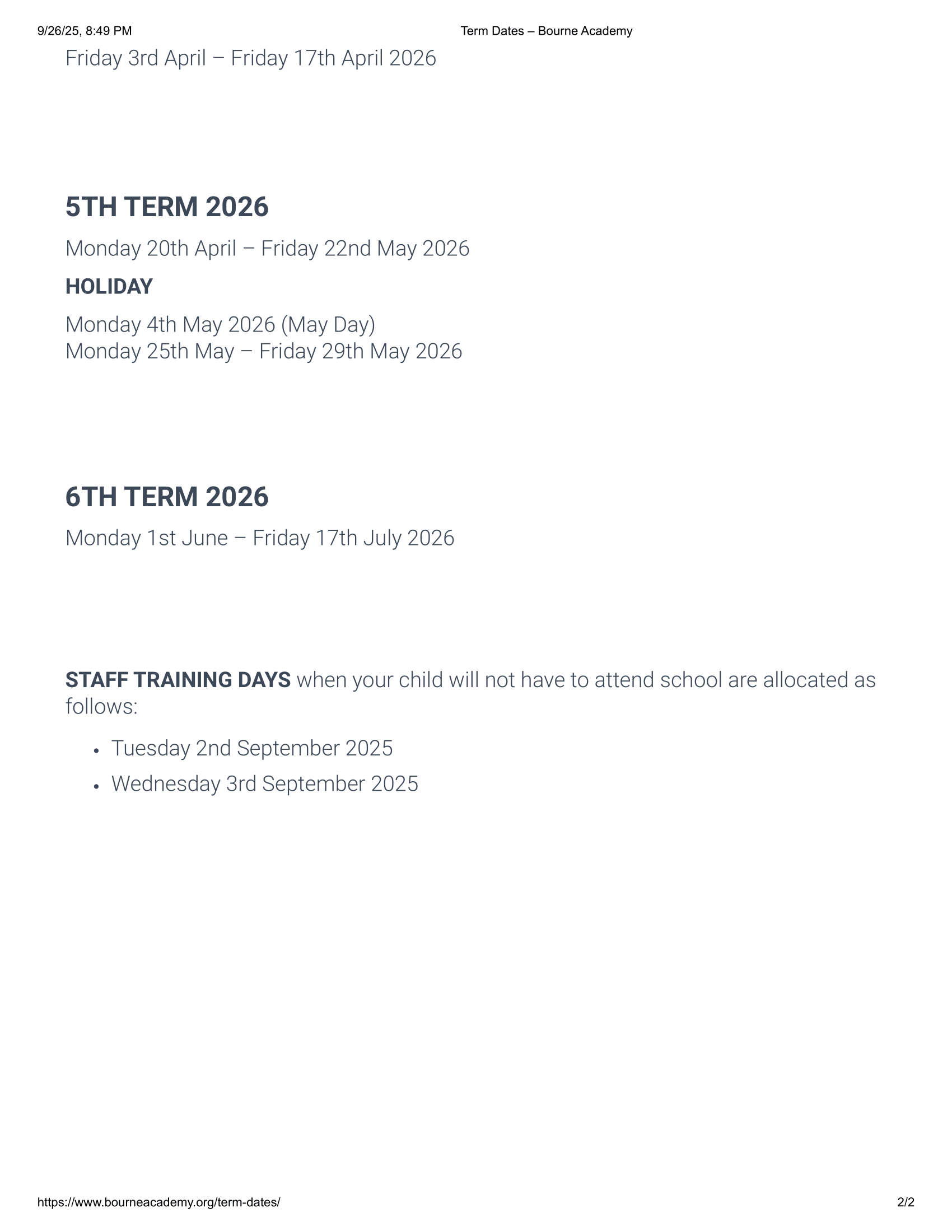 Bourne Academy — Term Dates (2025–2026)