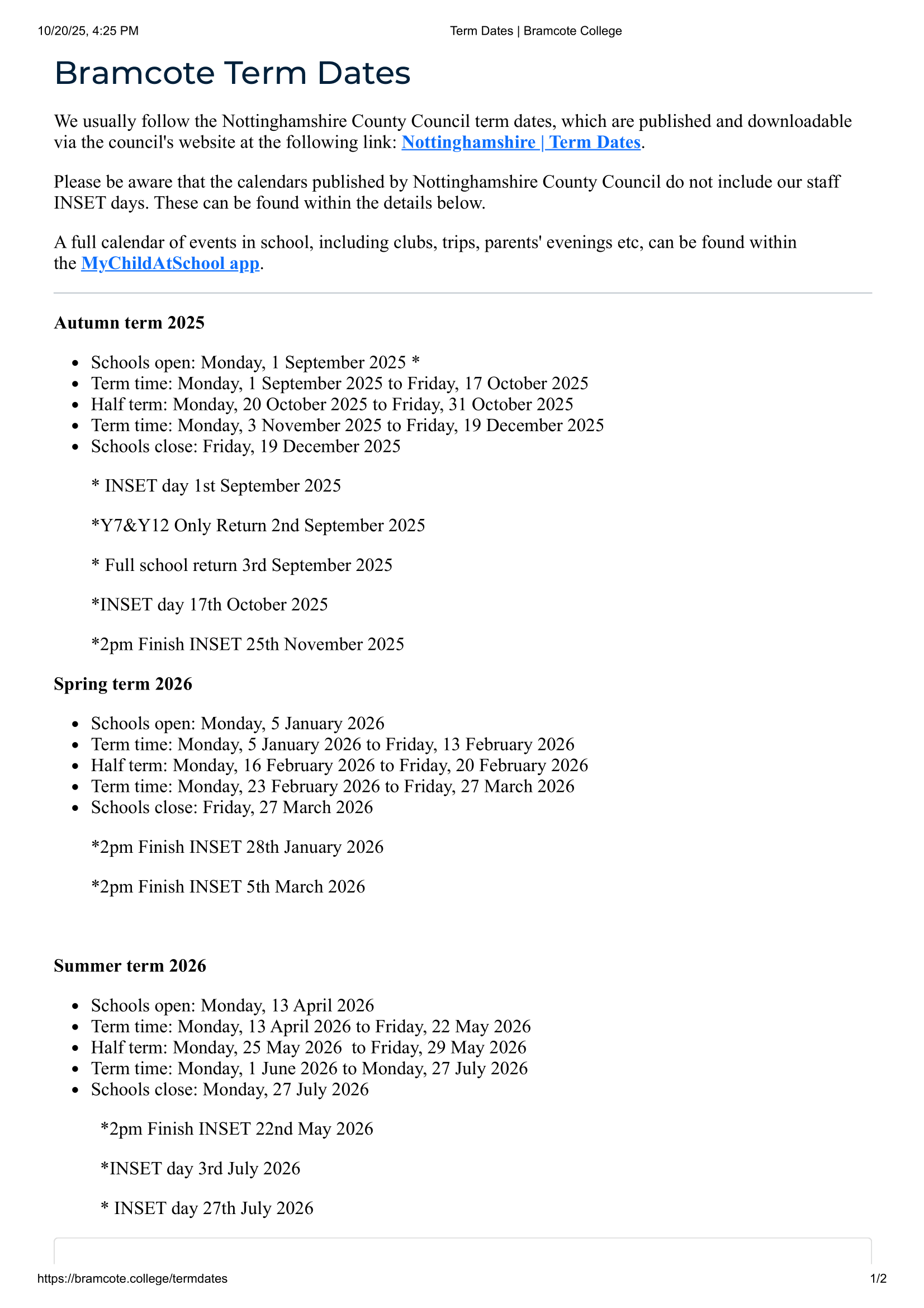 - All dates are taken directly from the Bramcote College term-dates page for 2025–2026.