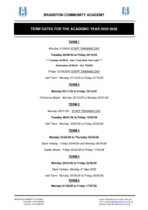 The school Term Dates shown on this page has been sourced directly from the official Branston Community Academy term dates website. Please be aware that all dates and events may be amended at the discretion of the school or local council. For the most up-to-date and accurate information, we recommend checking the official council website or contacting the school office.