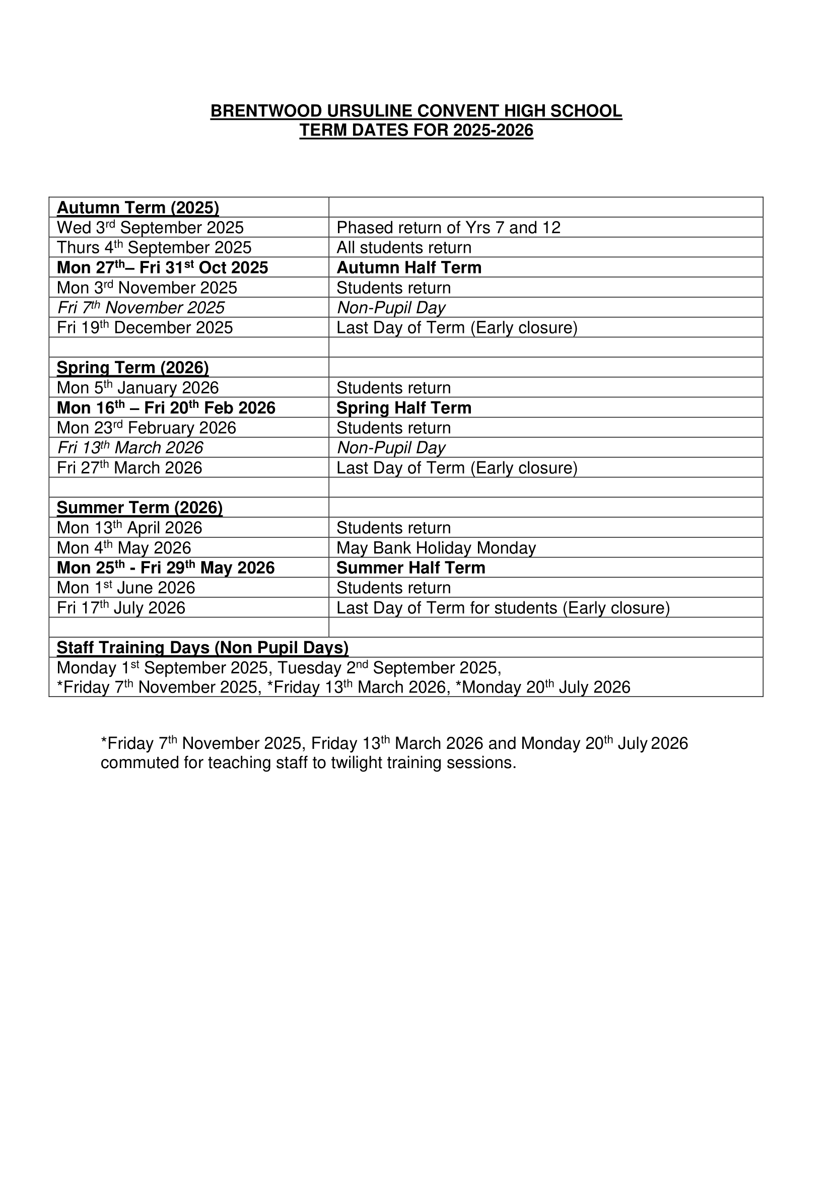 Brentwood Ursuline Convent High School – Term Dates 2025–2026