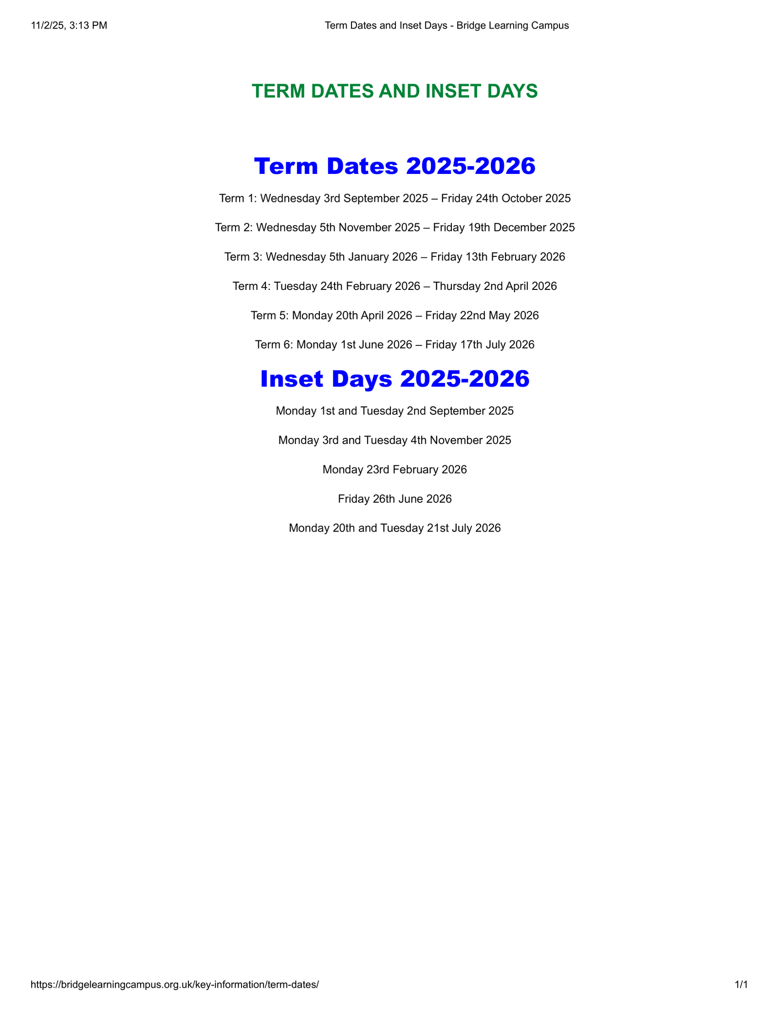 Bridge Learning Campus Term dates (2025-2026)