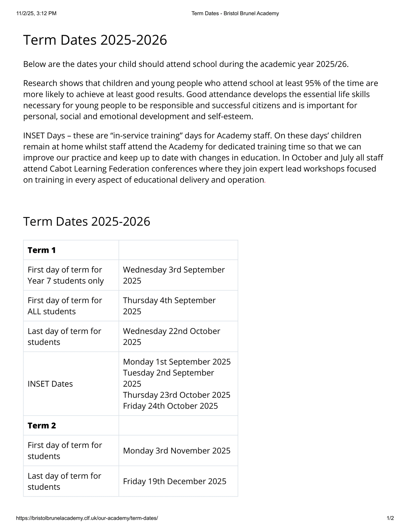 What are the Inset Days for 2025–2026?