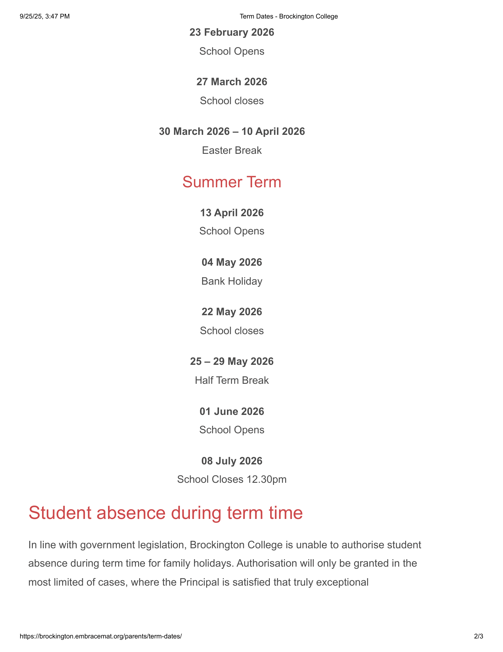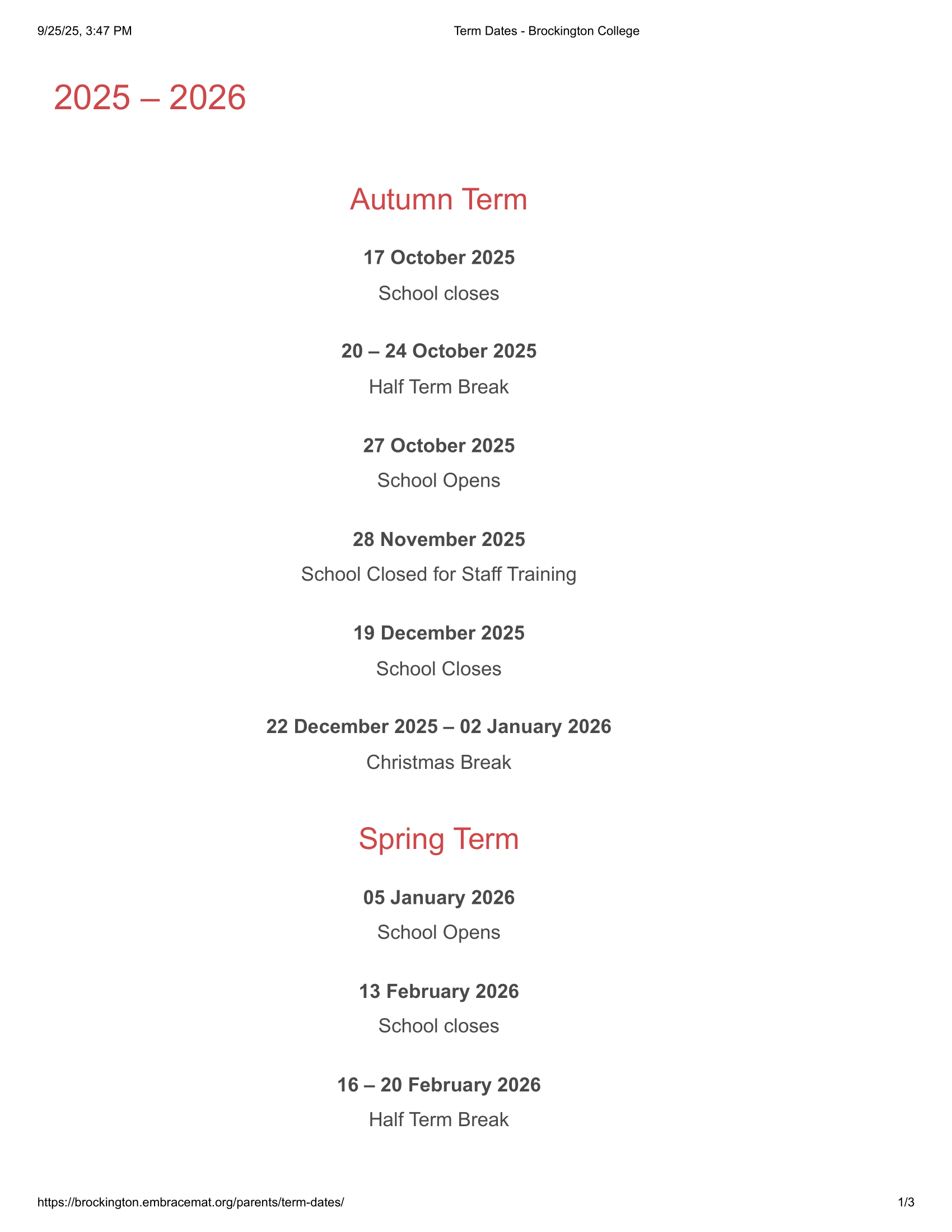 The school Term Dates shown on this page has been sourced directly from the official Brockington College term dates website. Please be aware that all dates and events may be amended at the discretion of the school or local council. For the most up-to-date and accurate information, we recommend checking the official council website or contacting the school office.