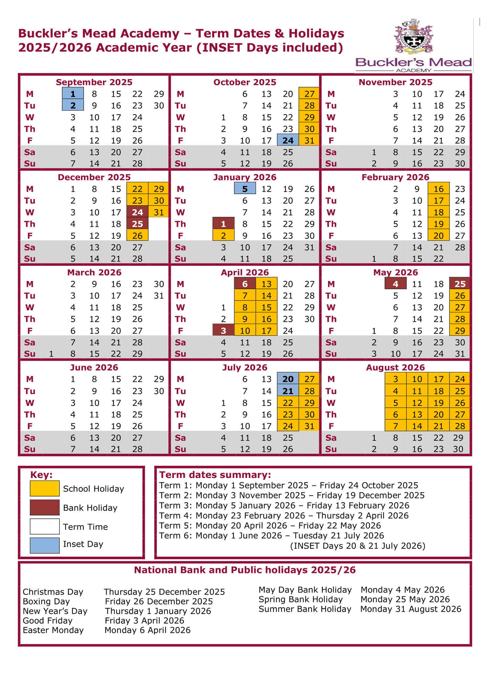Buckler’s Mead Academy Term Dates 2025/2026