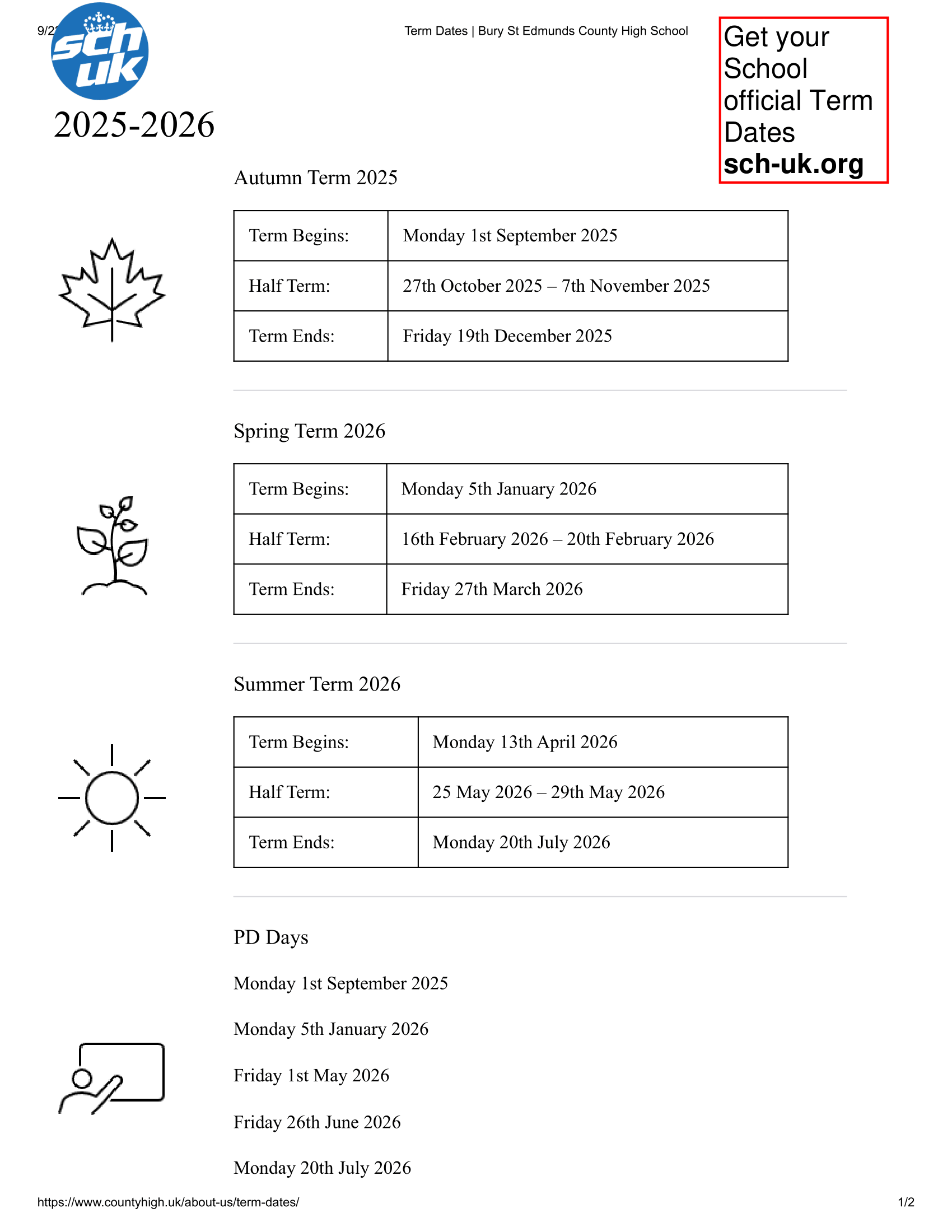 The school Term Dates shown on this page has been sourced directly from the official Bury St Edmunds County High School term dates website. Please be aware that all dates and events may be amended at the discretion of the school or local council. For the most up-to-date and accurate information, we recommend checking the official council website or contacting the school office.