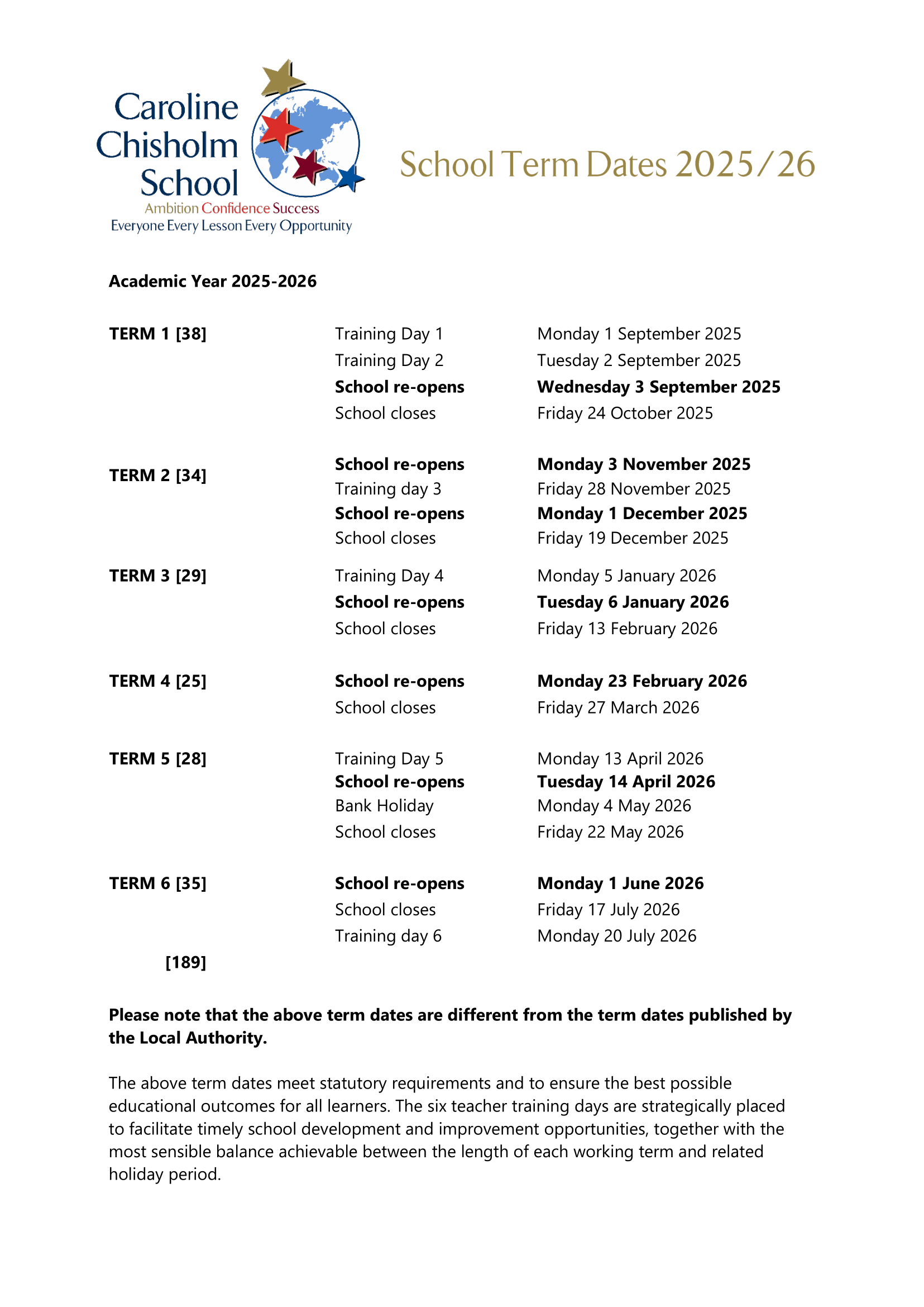 Caroline Chisholm School 25-26 Term Dates Revised [pdf]