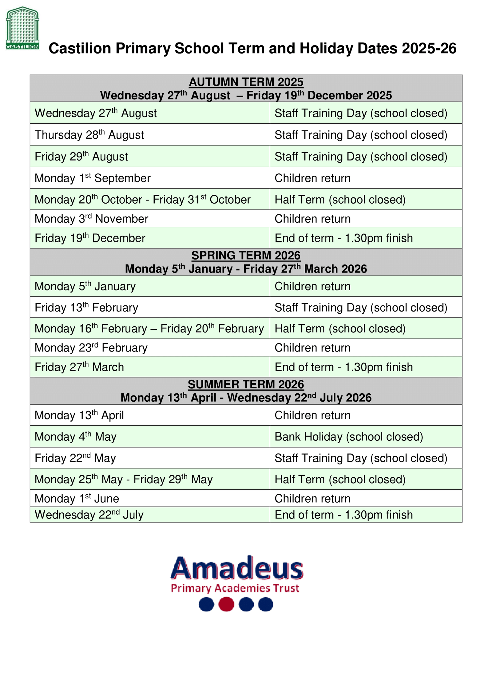 Castilion Primary School Term Dates 2025-26