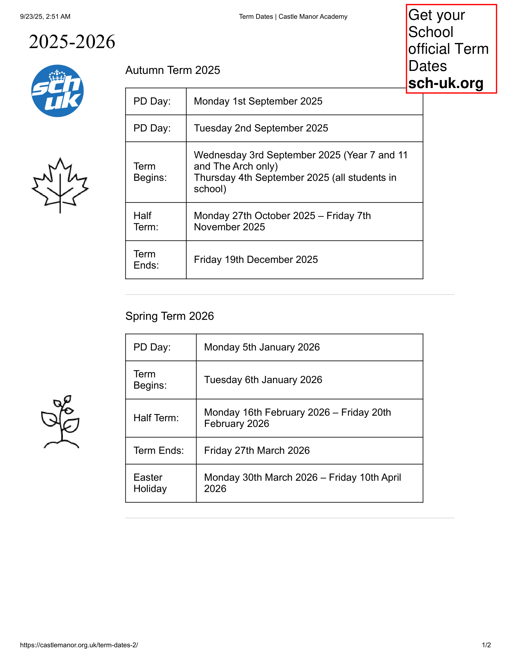 The school Term Dates shown on this page has been sourced directly from the official Castle Manor Academy term dates website. Please be aware that all dates and events may be amended at the discretion of the school or local council. For the most up-to-date and accurate information, we recommend checking the official council website or contacting the school office.