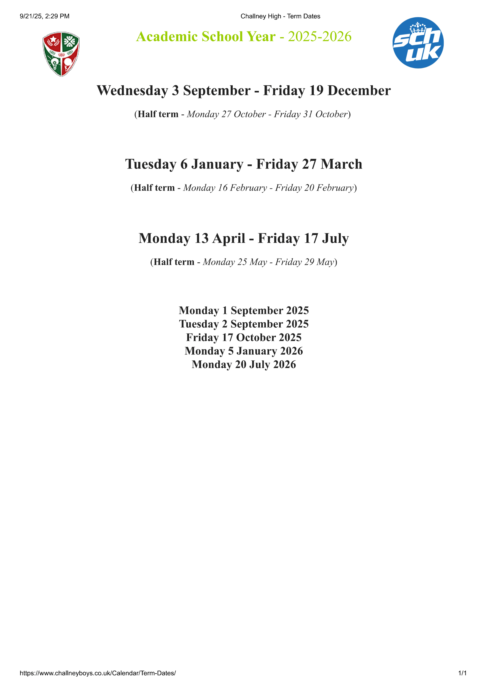 The school Term Dates shown on this page has been sourced directly from the official Challney High - Term Dates term dates website. Please be aware that all dates and events may be amended at the discretion of the school or local council. For the most up-to-date and accurate information, we recommend checking the official council website or contacting the school office.