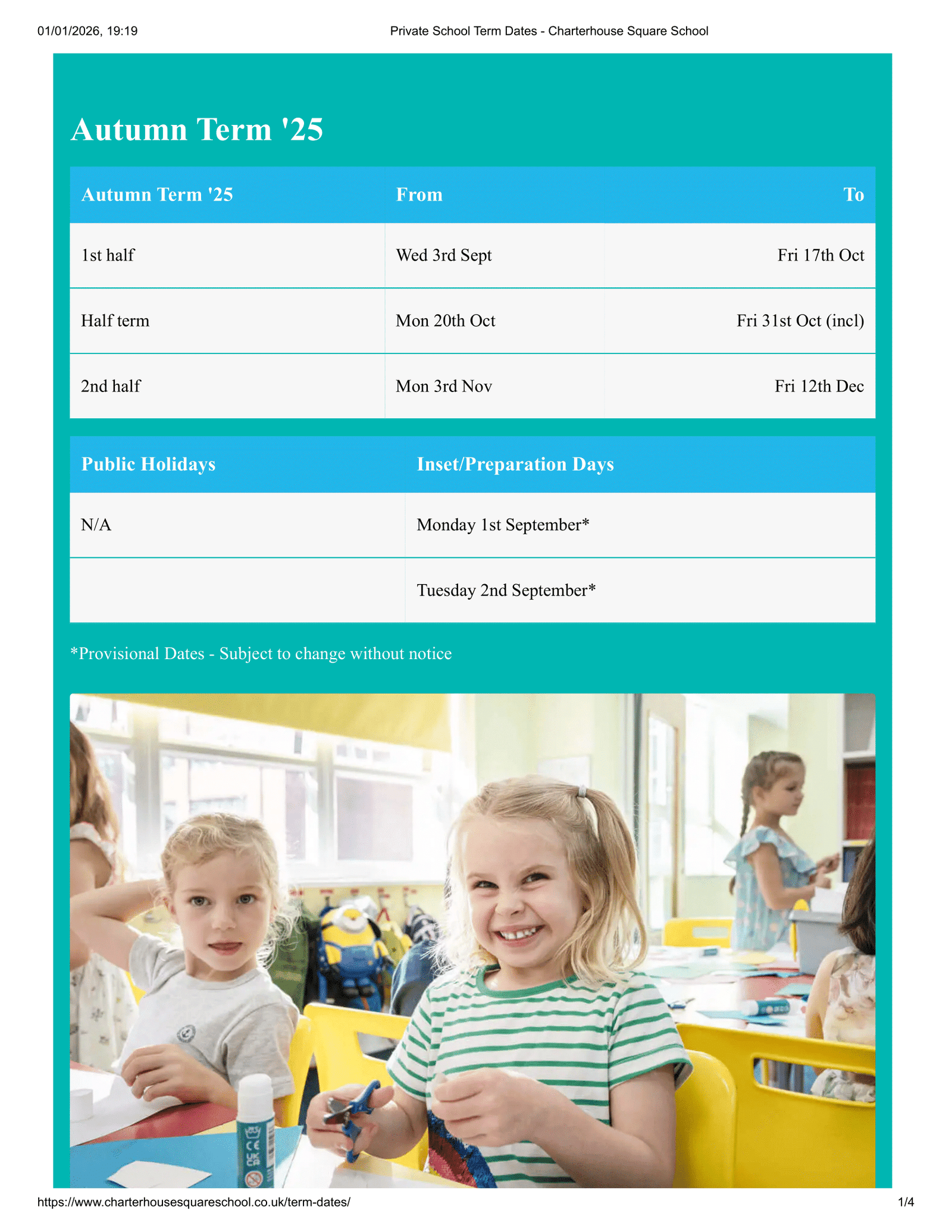 Wednesday 3 September 2025 – Friday 24 October 2025, then resumes Monday 3 November 2025 – Thursday 18 December 2025 (last day 2pm finish).