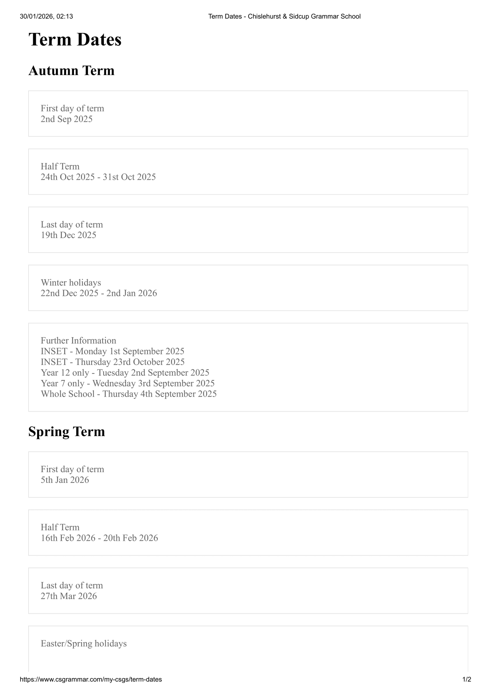The school Term Dates shown on this page has been sourced directly from the official Chislehurst & Sidcup Grammar School 25-26 Term Dates Revised PDF website. Please be aware that all dates and events may be amended at the discretion of the school or local council. For the most up-to-date and accurate information, we recommend checking the official council website or contacting the school office.