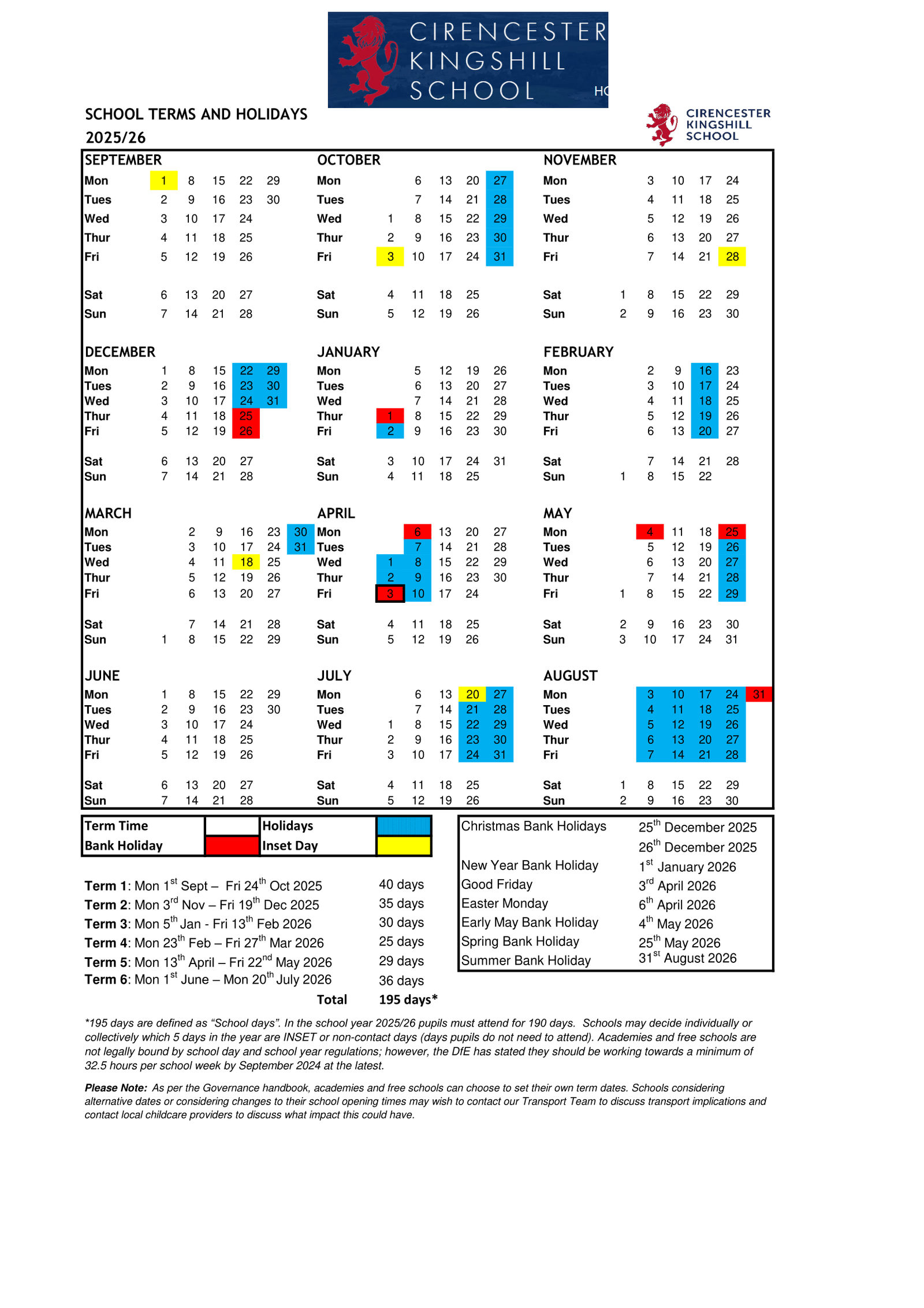 There are a total of 195 days in the 2025/26 school year at Cirencester Kingshill School, including inset days.