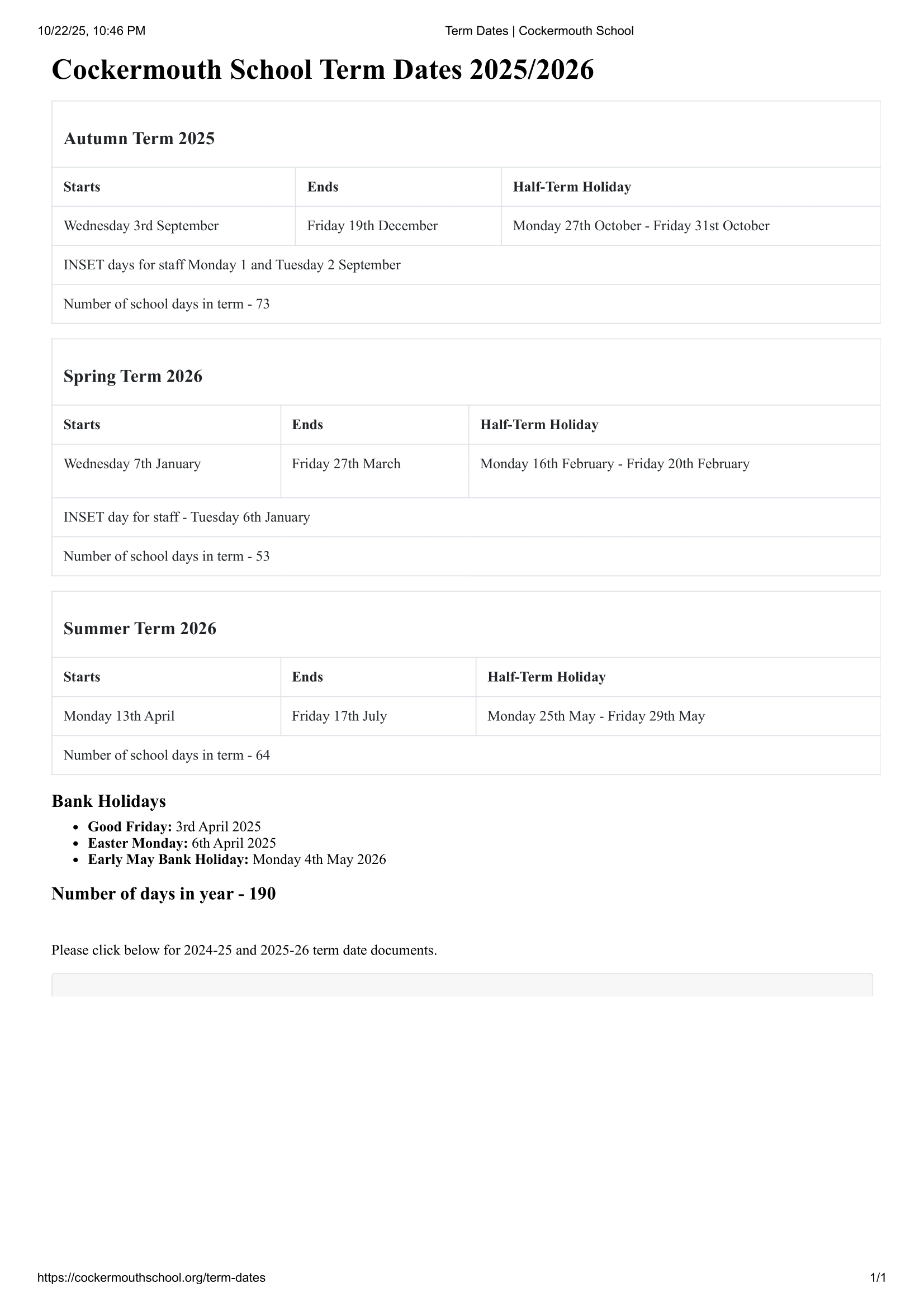 The school Term Dates shown on this page has been sourced directly from the official Cockermouth School Term Dates 25-26 Official Update website. Please be aware that all dates and events may be amended at the discretion of the school or local council. For the most up-to-date and accurate information, we recommend checking the official council website or contacting the school office.